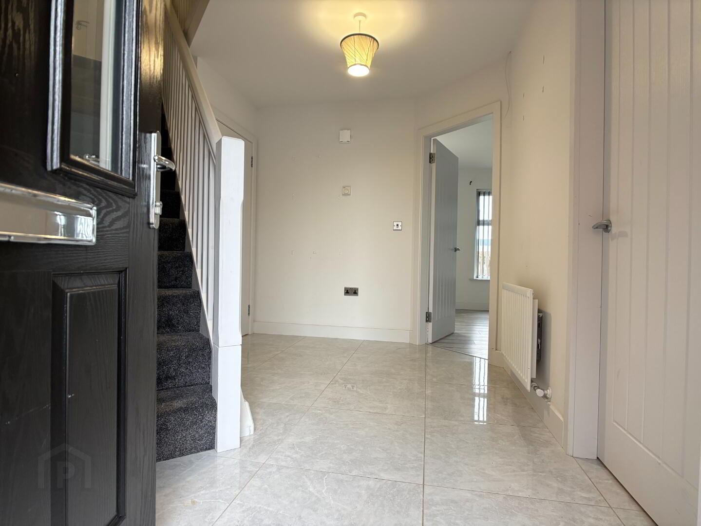 Part glazed composite black entrance door leading to spacious hallway, ceramic tile flooring and single panel radiator. Downstairs wc off.