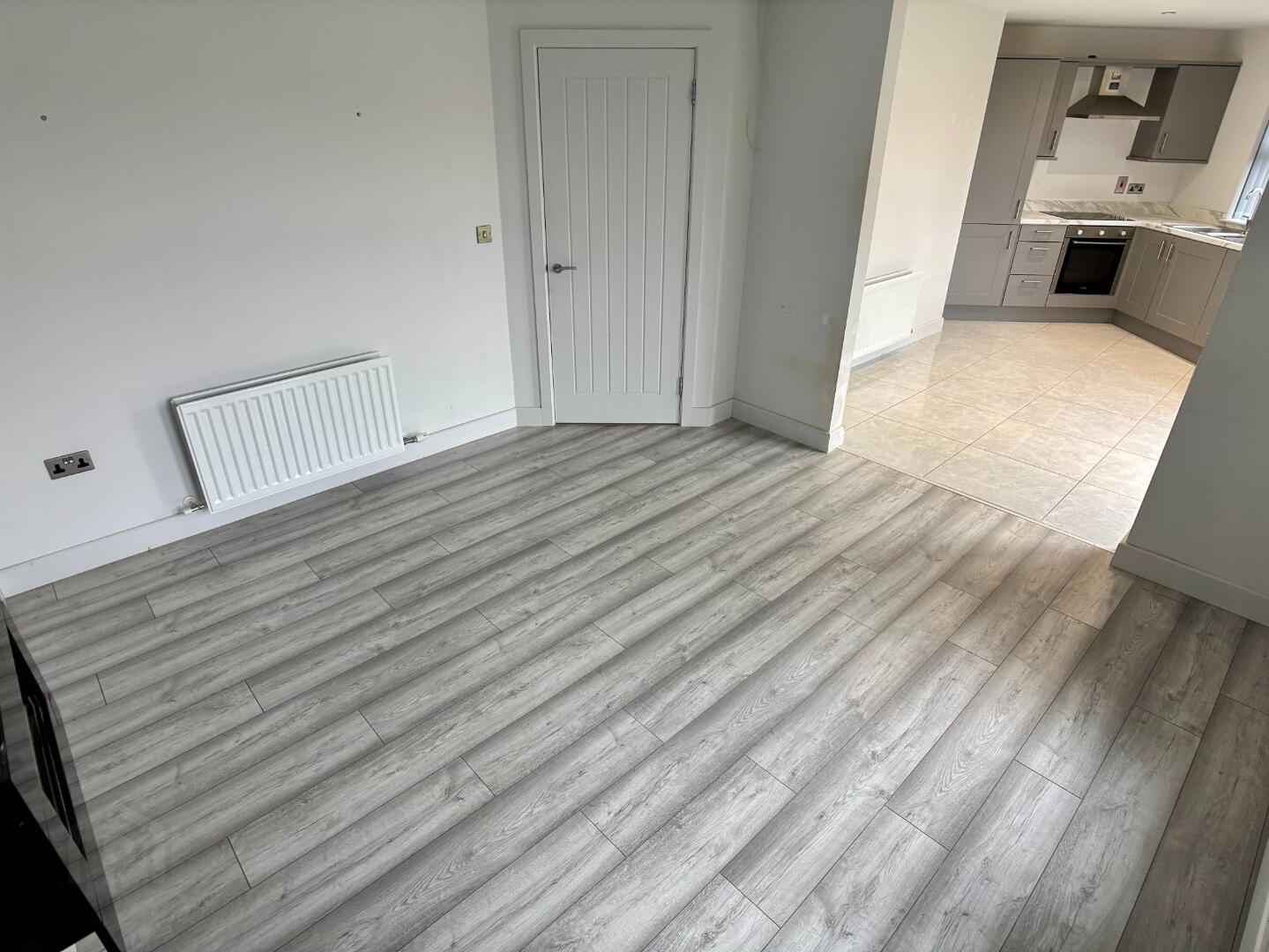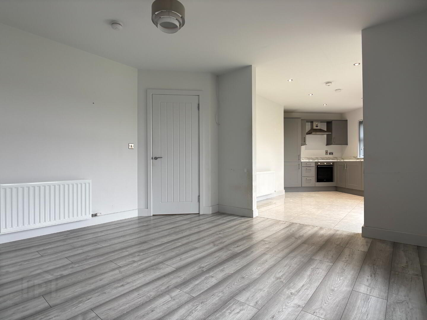 Open plan rear aspect living room with arch through to kitchen. Wall mounted gas fire, laminate flooring and double panel radiator.