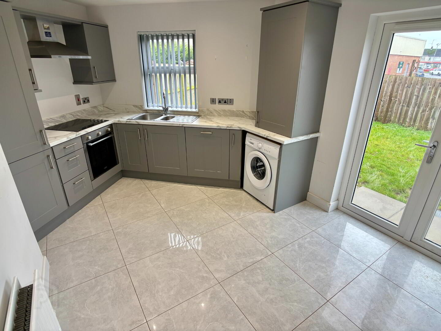 A good range of high and low level cupboards and drawers, 1.5 stainless steel sink bowls and drainer, integrated oven and hob with stainless steel extractor fan above. Integrated dishwasher and space for washing machine, ceramic tile flooring, double panel radiator and recessed downlighting. Glazed double patio doors leading to rear of property.