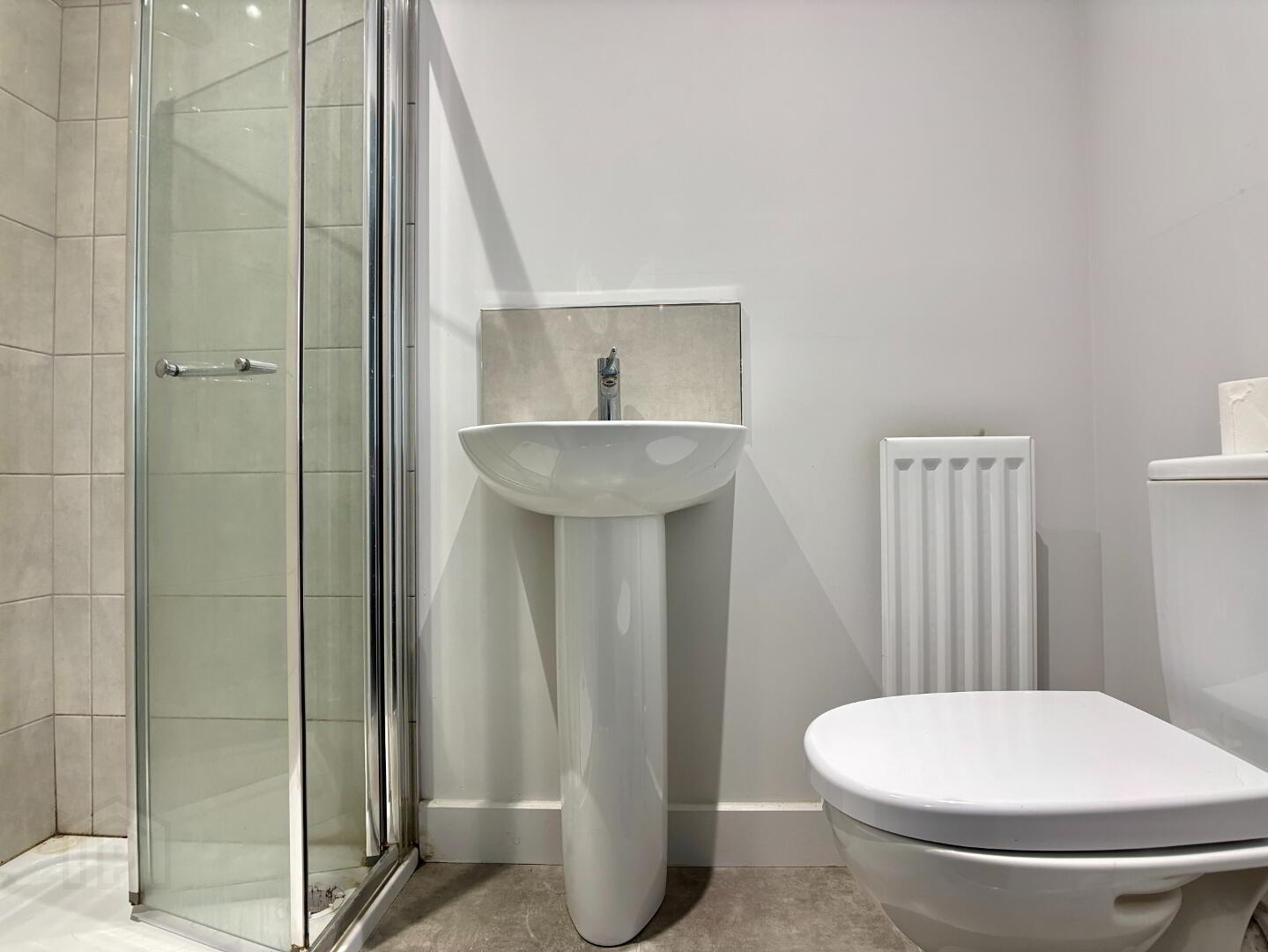 Three piece white suite comprising tiled shower cubicle with mains shower fitment and folding glazed panel, pedestal wash hand basin and dual flush wc. Single panel radiator, recessed downlighting, extractor fan and ceramic tile flooring.