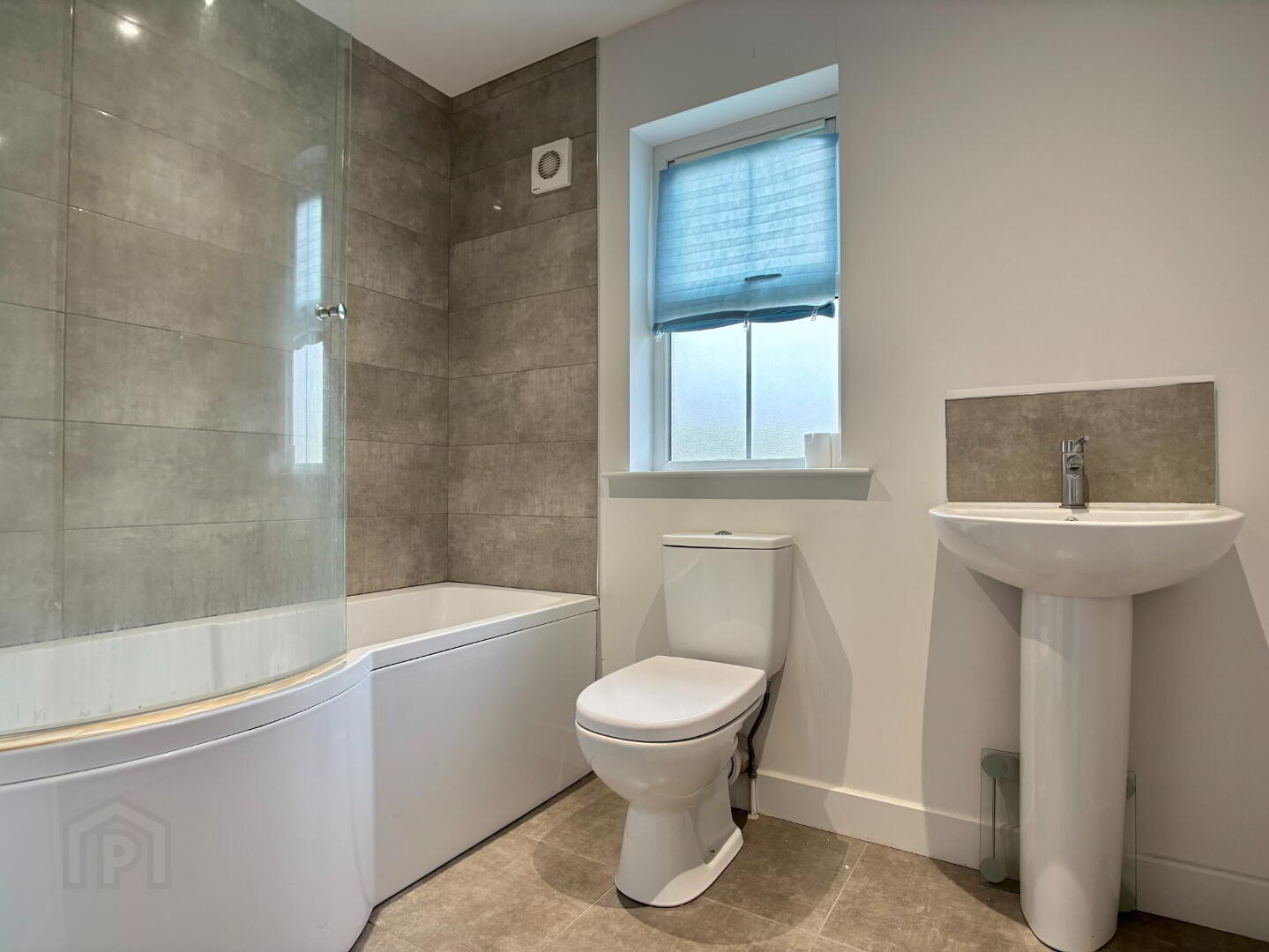 Three piece white suite comprising panelled bath with mains fitted shower and glazed swivel panel, pedestal wash hand basin with tiled splashback and dual flush wc. Part tiled walls, recessed downlighting, single panel radiator, extractor fan and ceramic tile flooring.