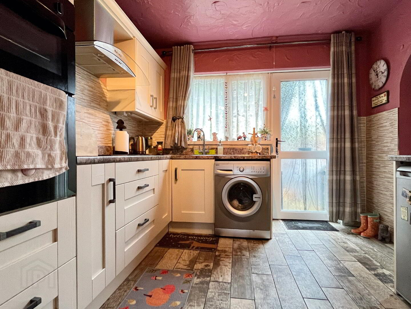 An excellent range of high and low level cupboards and drawers, 1.5 stainless steel sink bowl and drainer, integrated oven and hob with stainless steel extractor fan above. Space for undercounter fridge, freezer and washing machine, double panel radiator, part tiled walls and vinyl wood effect flooring. Curtains and curtain poles. Arch through to dining area.