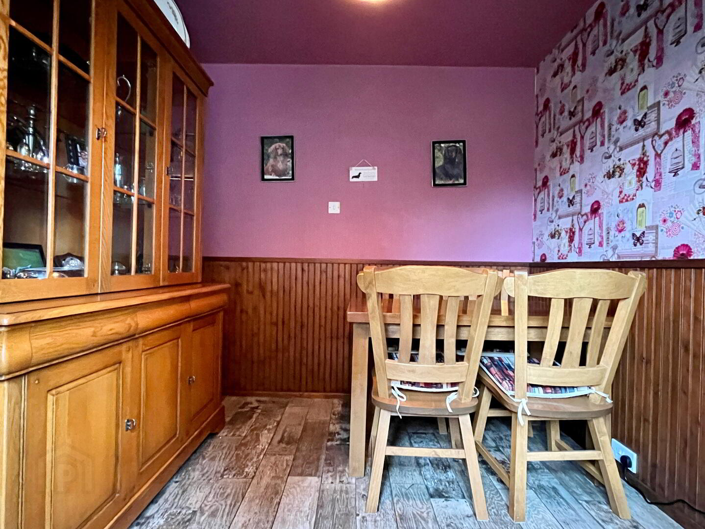 Rear aspect dining room, part panelled walls, single panel radiator, curtain poles, curtains and vinyl wood effect flooring. Arch through to kitchen.