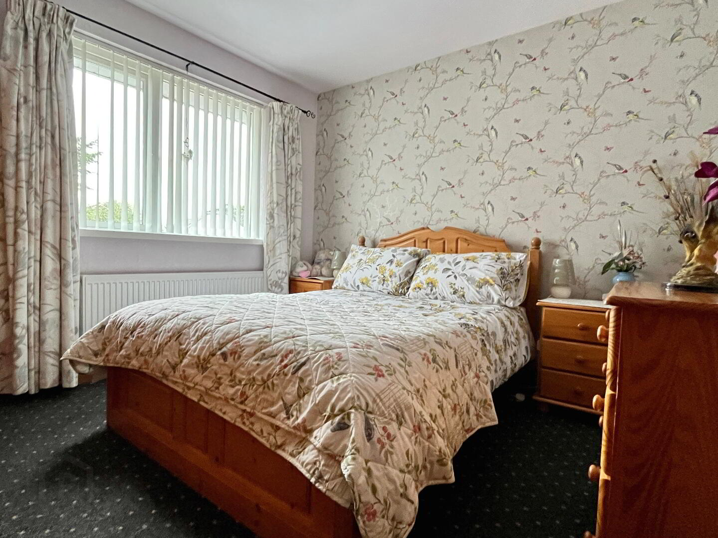 Rear aspect double bedroom with built in wardrobe, single panel radiator, carpet flooring, vertical blinds, curtain and curtain poles.