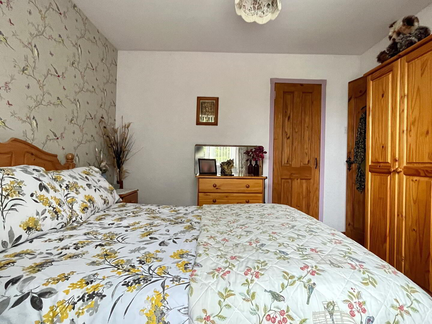 Access to roofspace, carpet flooring, curtain pole and curtains. Enclosed shelved hot press.