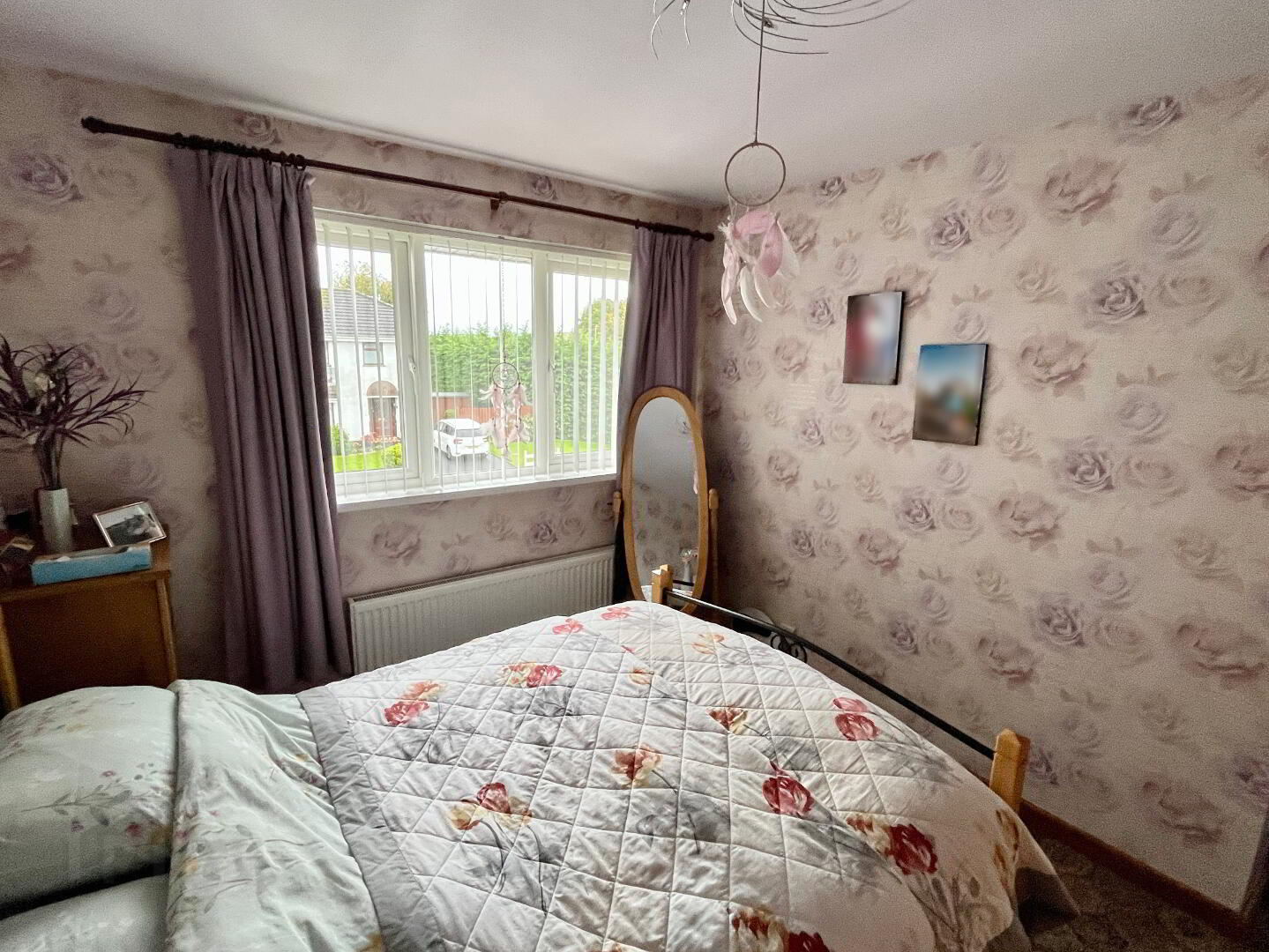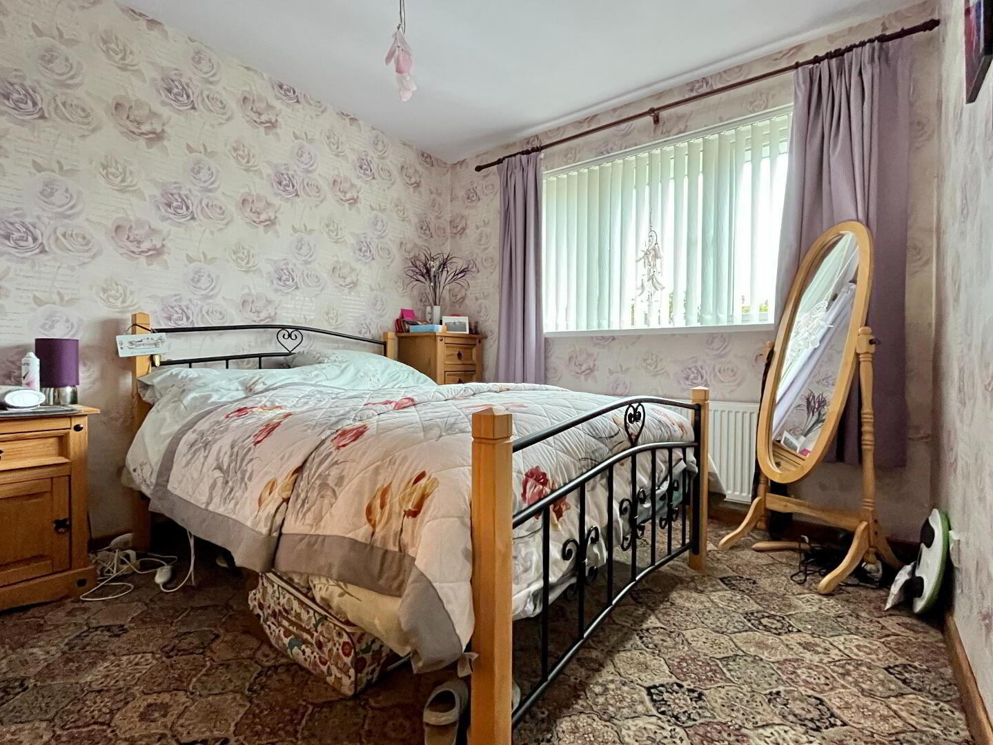 Front aspect double bedroom with built in wardrobe, single panel radiator and carpet flooring. Curtains and curtain pole and vertical blinds.