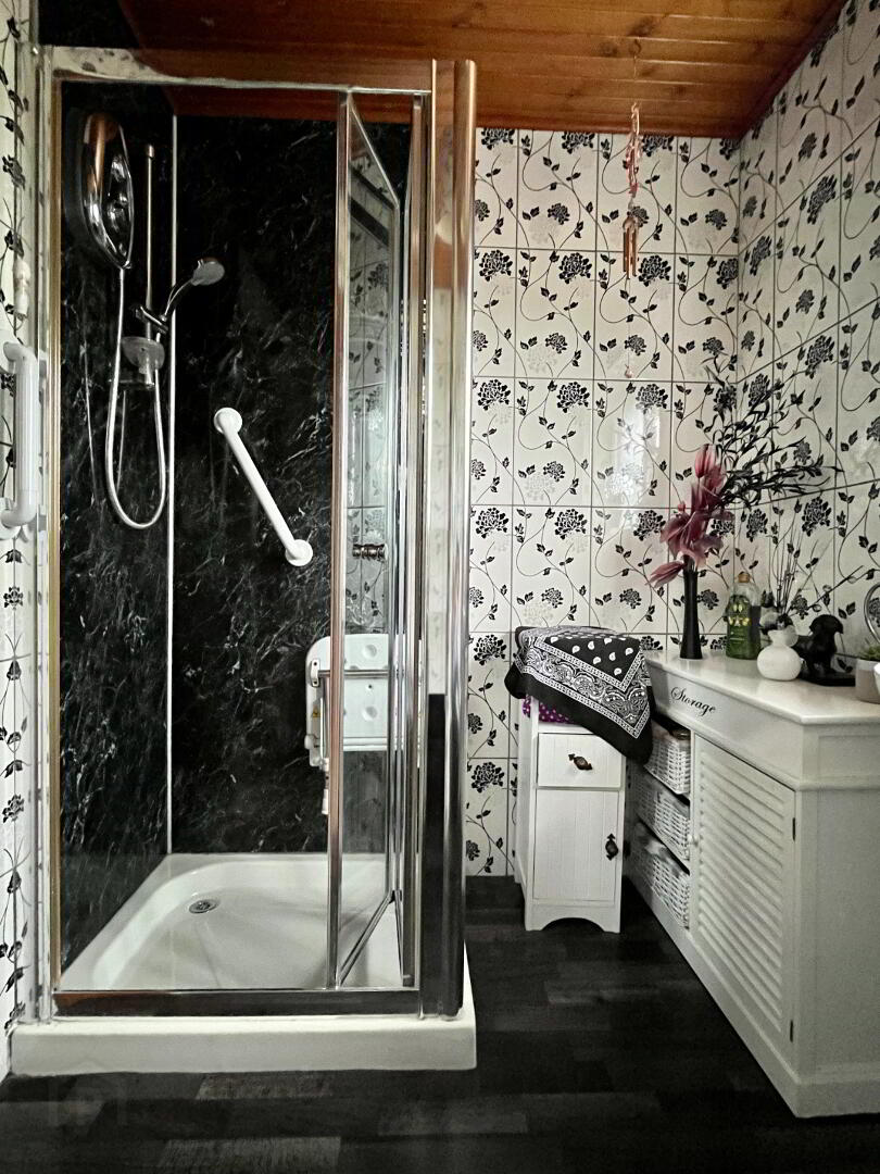 Three piece white suite comprising wall hung wash hand basin, corner shower with Mira electric shower and bi-fold glazed panel with PVC wall panelling and WC. Tiled walls, pine panelled ceiling, chrome towel rail and vinyl flooring.