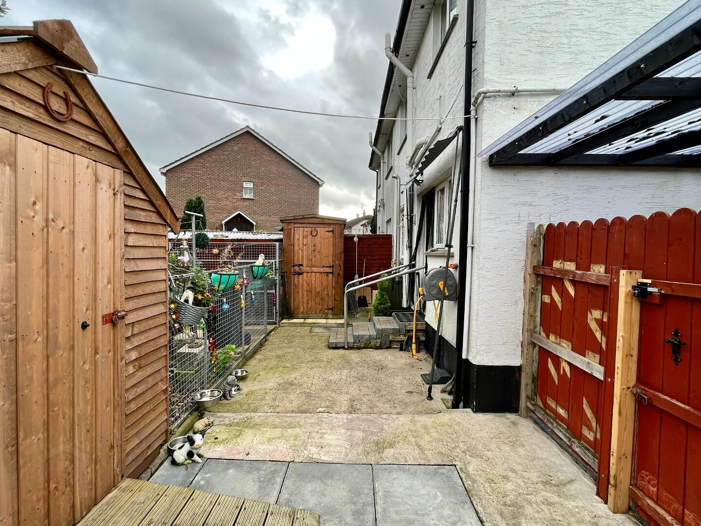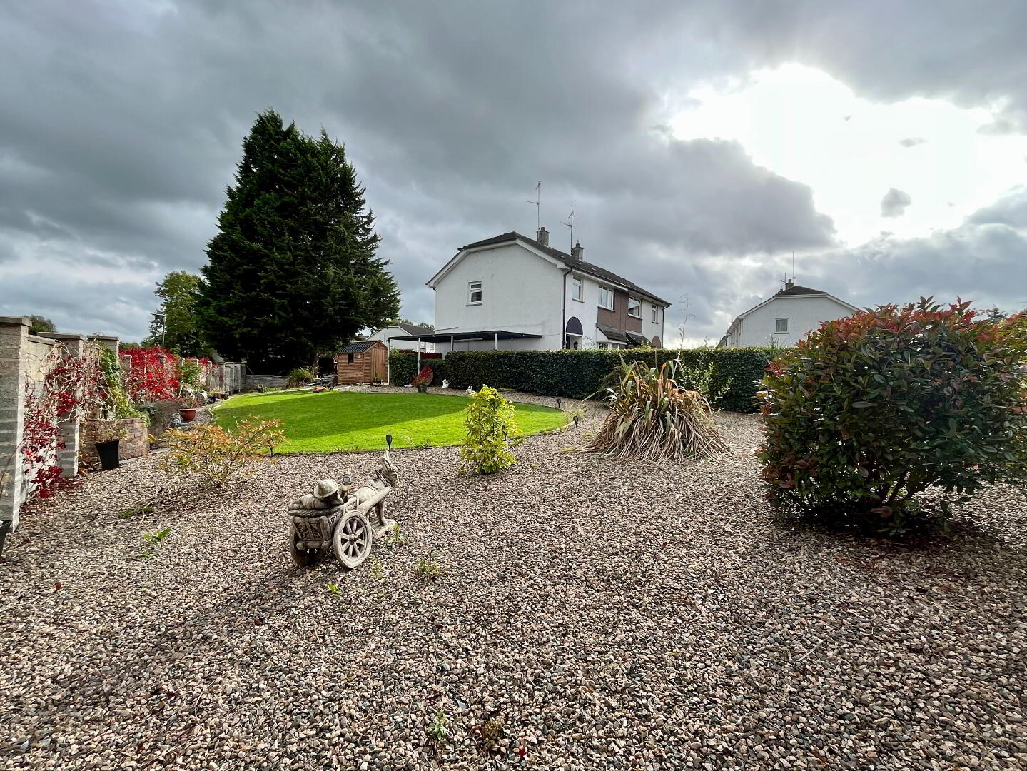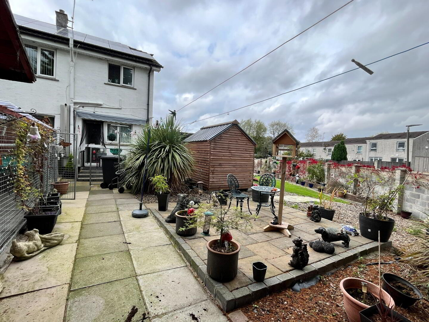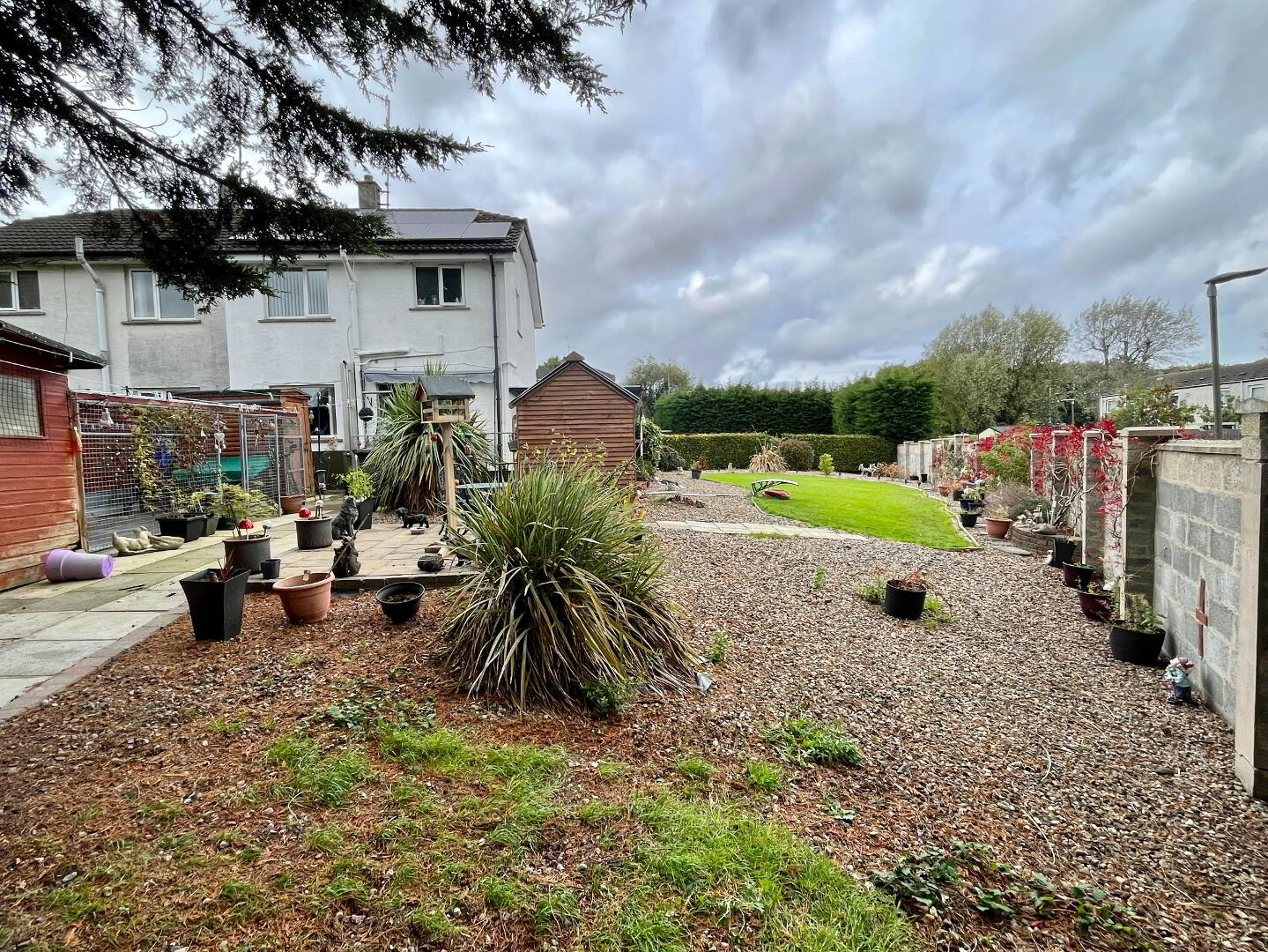 Low maintenance front pebbled garden with shrubs. Block paving driveway and path with lean to carport. Fully enclosed rear and side garden laid in lawn, pebbled area with shrubs. Paved patio and concrete area surrounded by hedging and border wall. Block paving step, water tap, access gate to front garden. Roof solar panels.