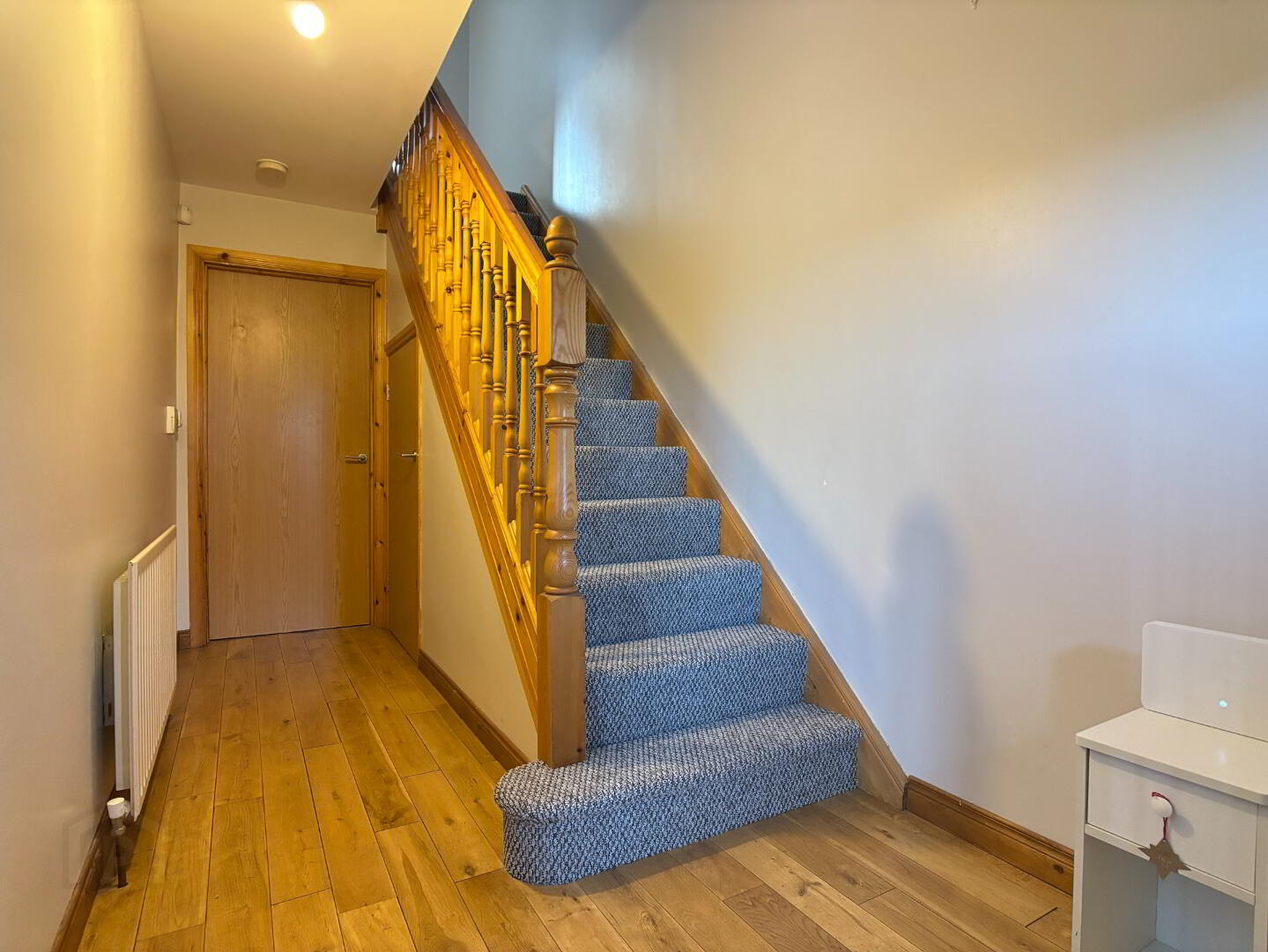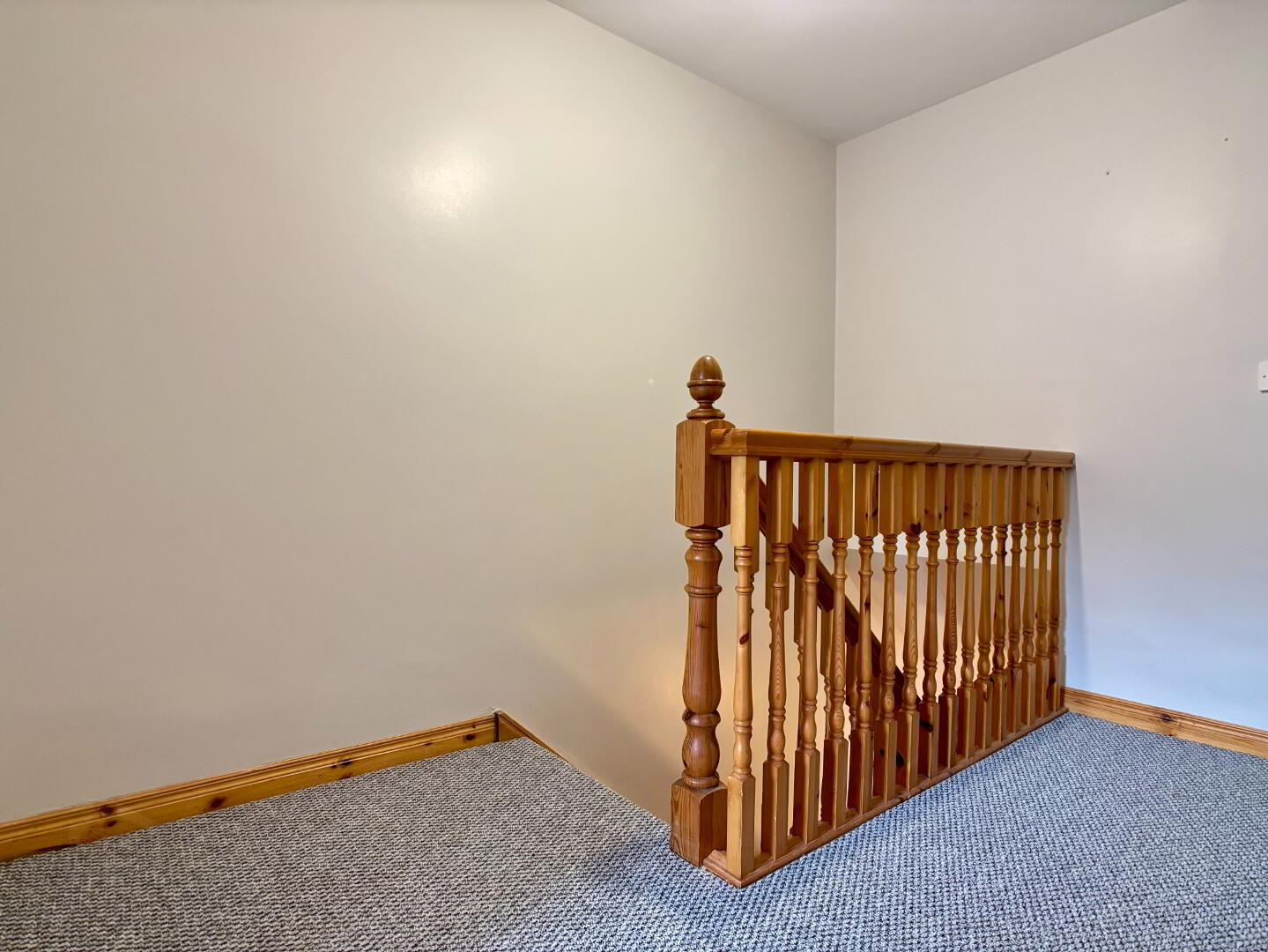 Pine spindle staircase leading to landing, enclosed hot press and carpet flooring. Access to roof space.