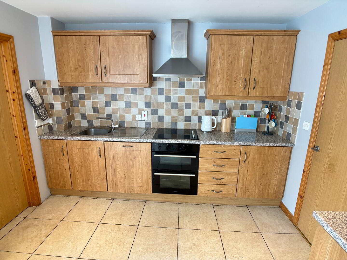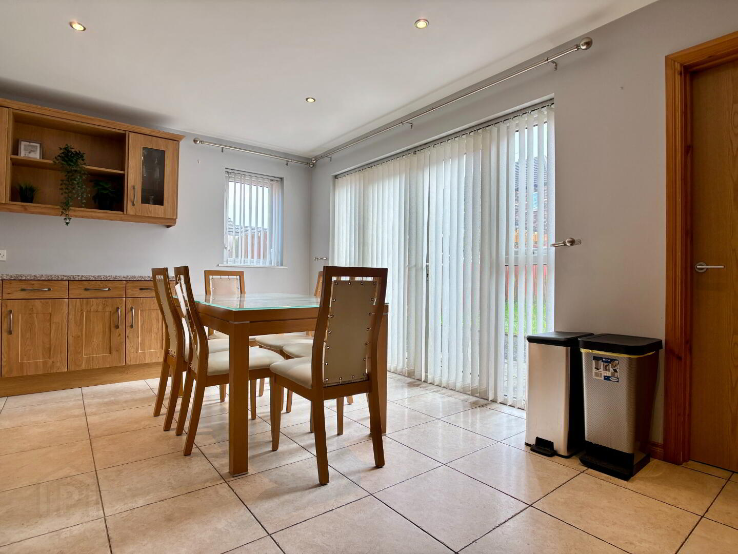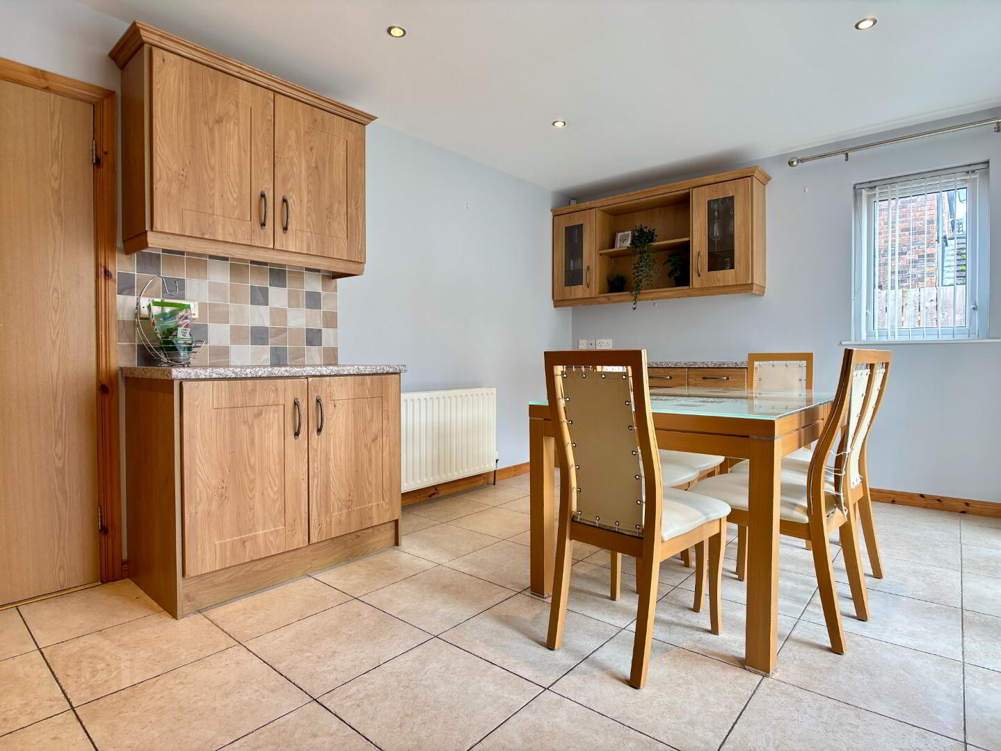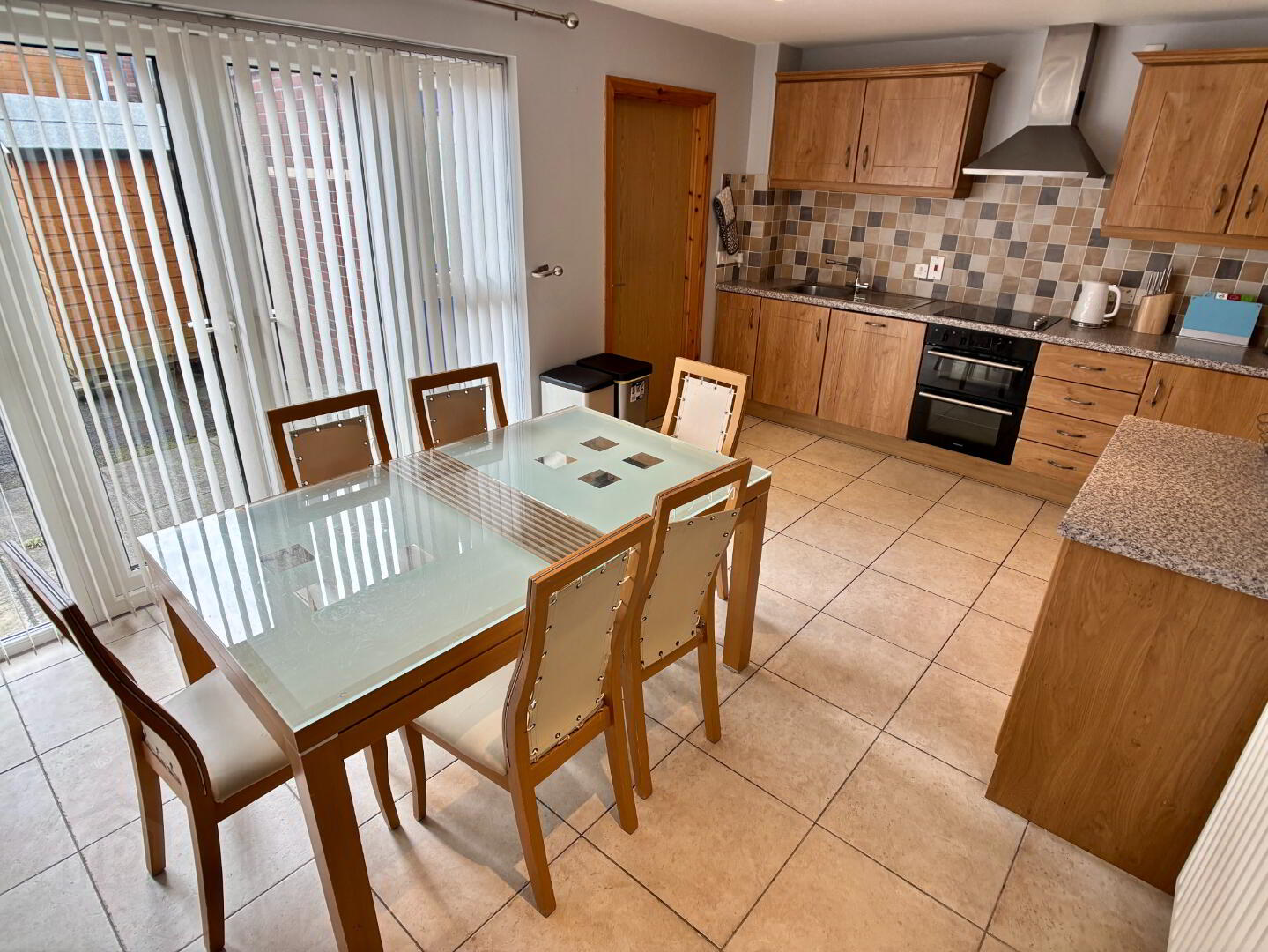 An excellent range of high and low level cupboard and drawers, stainless steel sink bowl and drainer, integrated oven and hob with stainless steel extractor fan above and integrated dishwasher. Part tiled walls, double panel radiator, vertical blinds, recessed downlighting and tiled flooring. Patio door leading to rear of property.