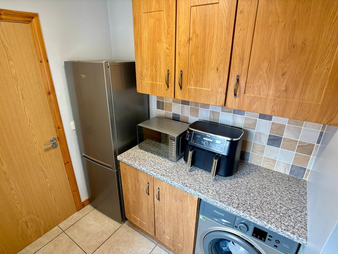 Utility room with high and low level cupboards, space for washing machine and fridge/freezer. Part tiled walls, tiled flooring, single panel radiator, extractor fan and access to roof space. Part glazed door leading to rear of property.