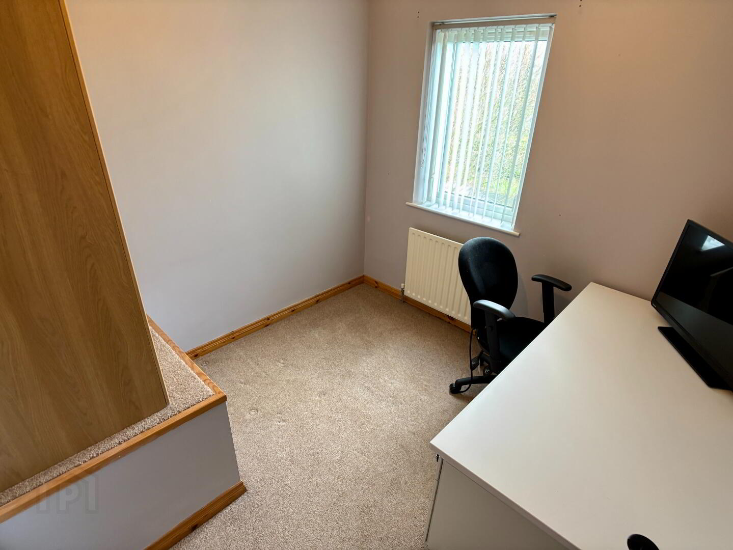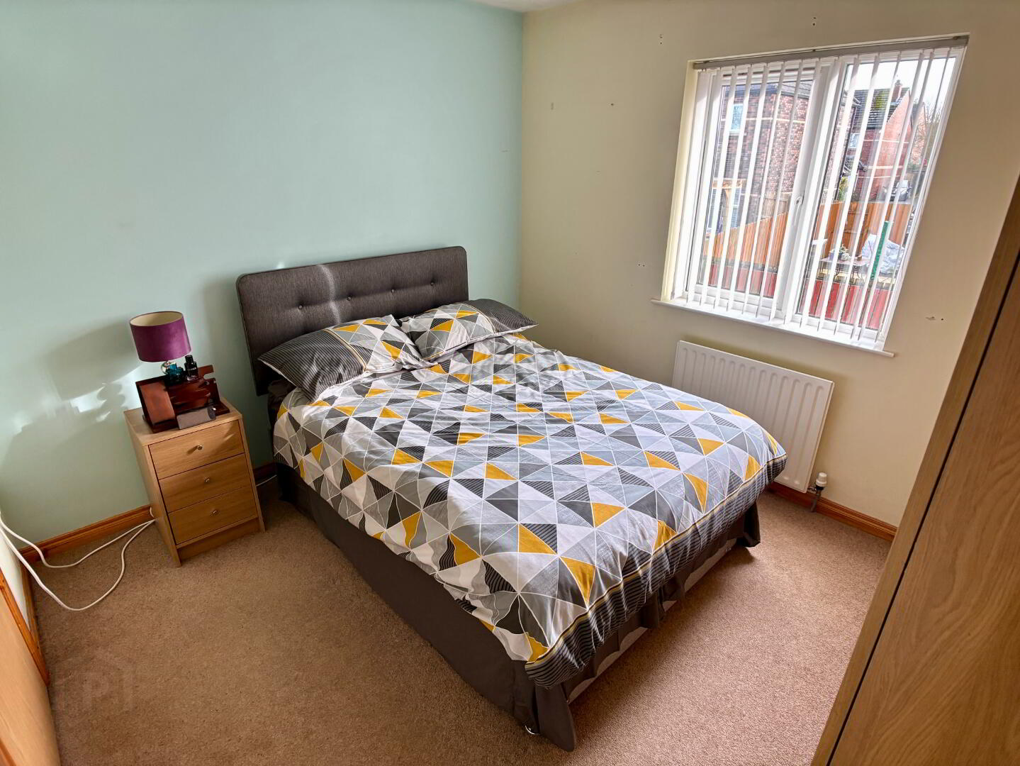 Rear aspect double bedroom with built in wardrobe, single panel radiator, vertical blinds and carpet flooring.