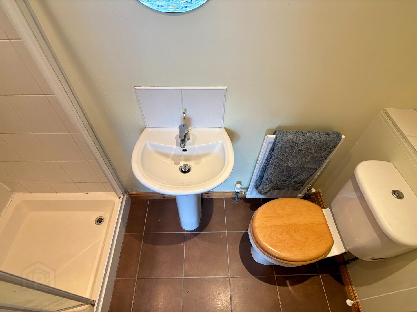 Three piece white suite comprising tiled shower cubicle with mains shower fitment and folding glazed panel, pedestal wash hand basin and wc. Single panel radiator, extractor fan and tiled flooring.