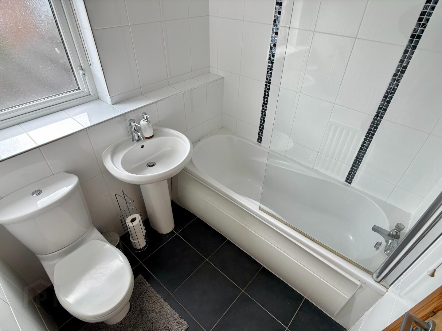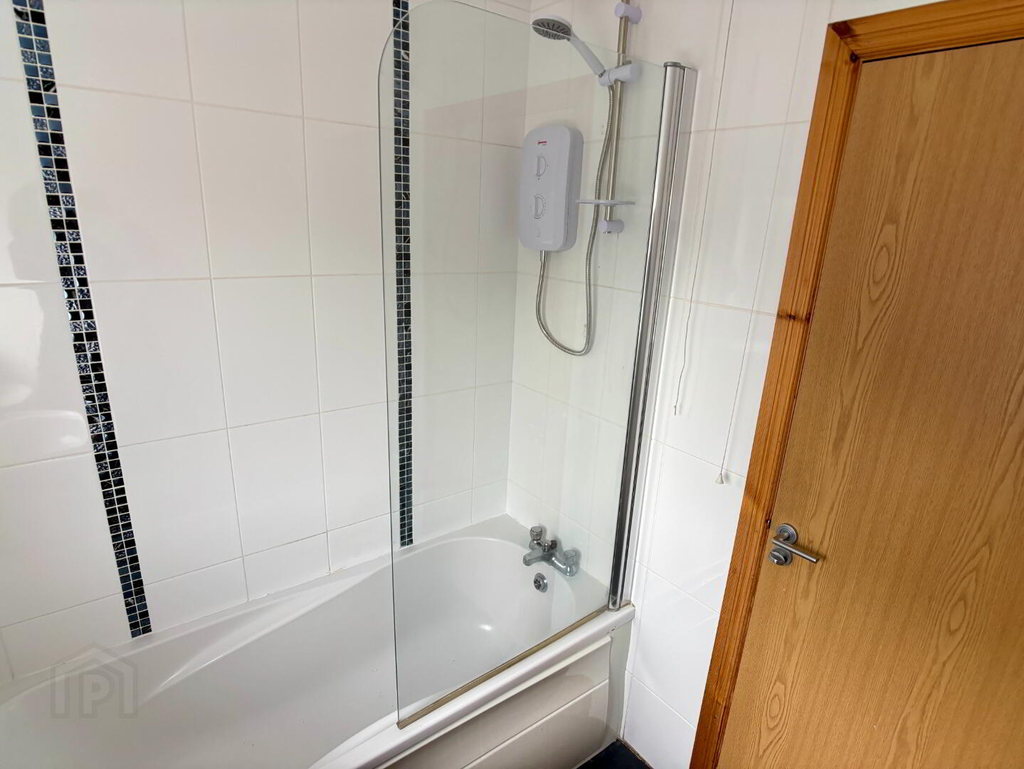 Three piece white suite comprising panelled bath with Redring electric shower fitment and glazed swivel panel, pedestal wash hand basin and wc. Single panel radiator, extractor fan, roller blind, tiled walls and flooring.