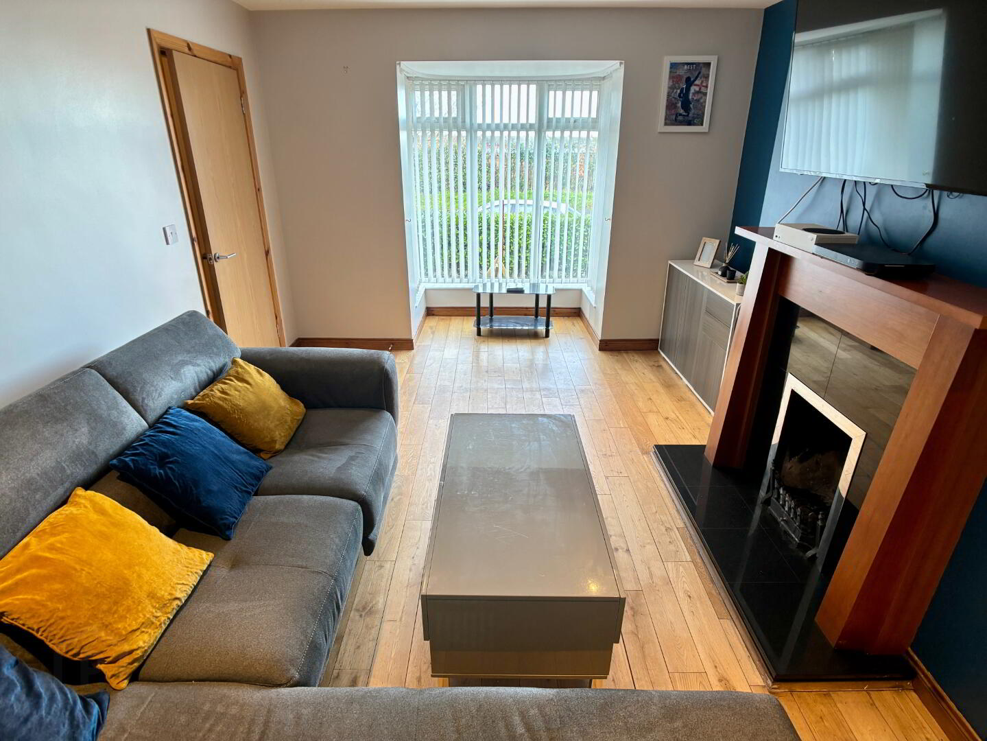 Front aspect living room with box bay window, open fire in feature fireplace, double panel radiator, vertical blinds, recessed downlighting and laminate flooring.