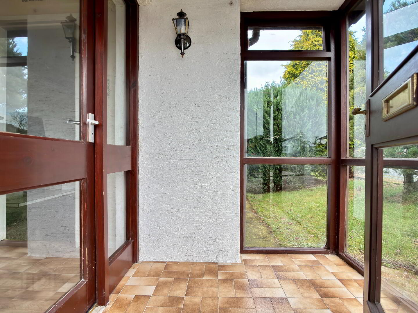 Glazed porch with wooden door and tile flooring leading to hallway.