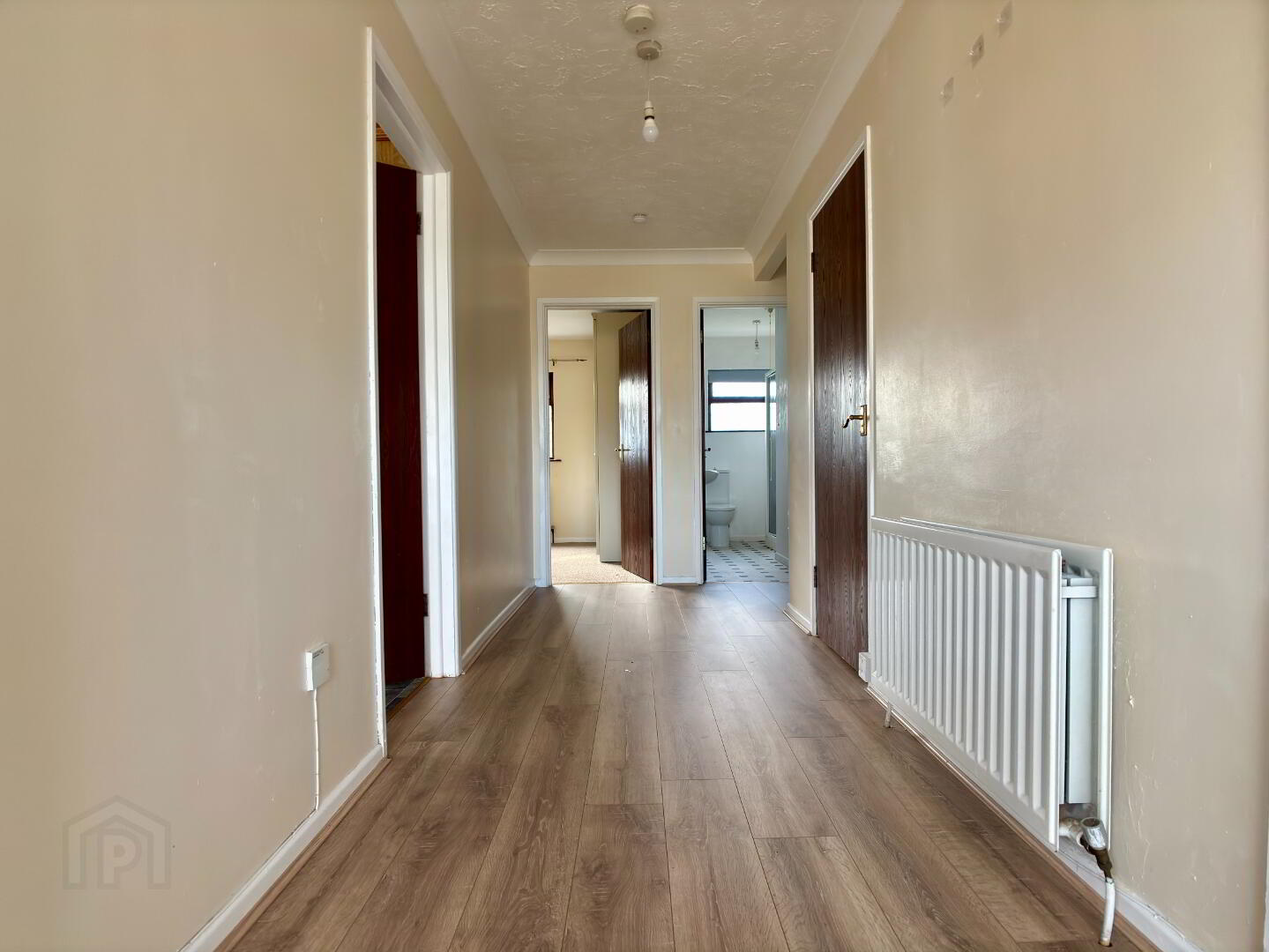 Glazed entrance door leading to hallway, enclosed storage cupboard and hot press, double panel radiator and laminate flooring.