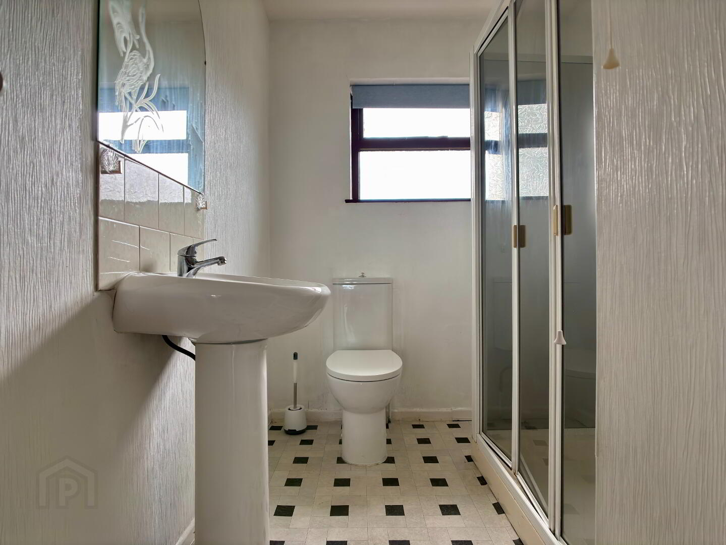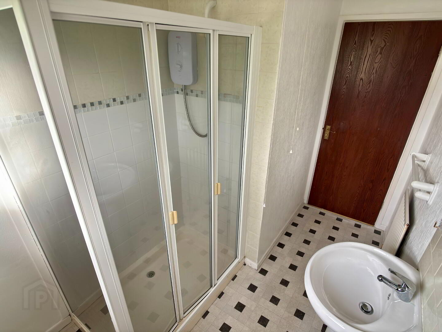 Three piece white suite comprising corner shower cubicle with electric shower and folding glazed panel, pedestal wash hand basin and wc. Part tiled walls, single panel radiator, extractor fan, roller blind and vinyl flooring.