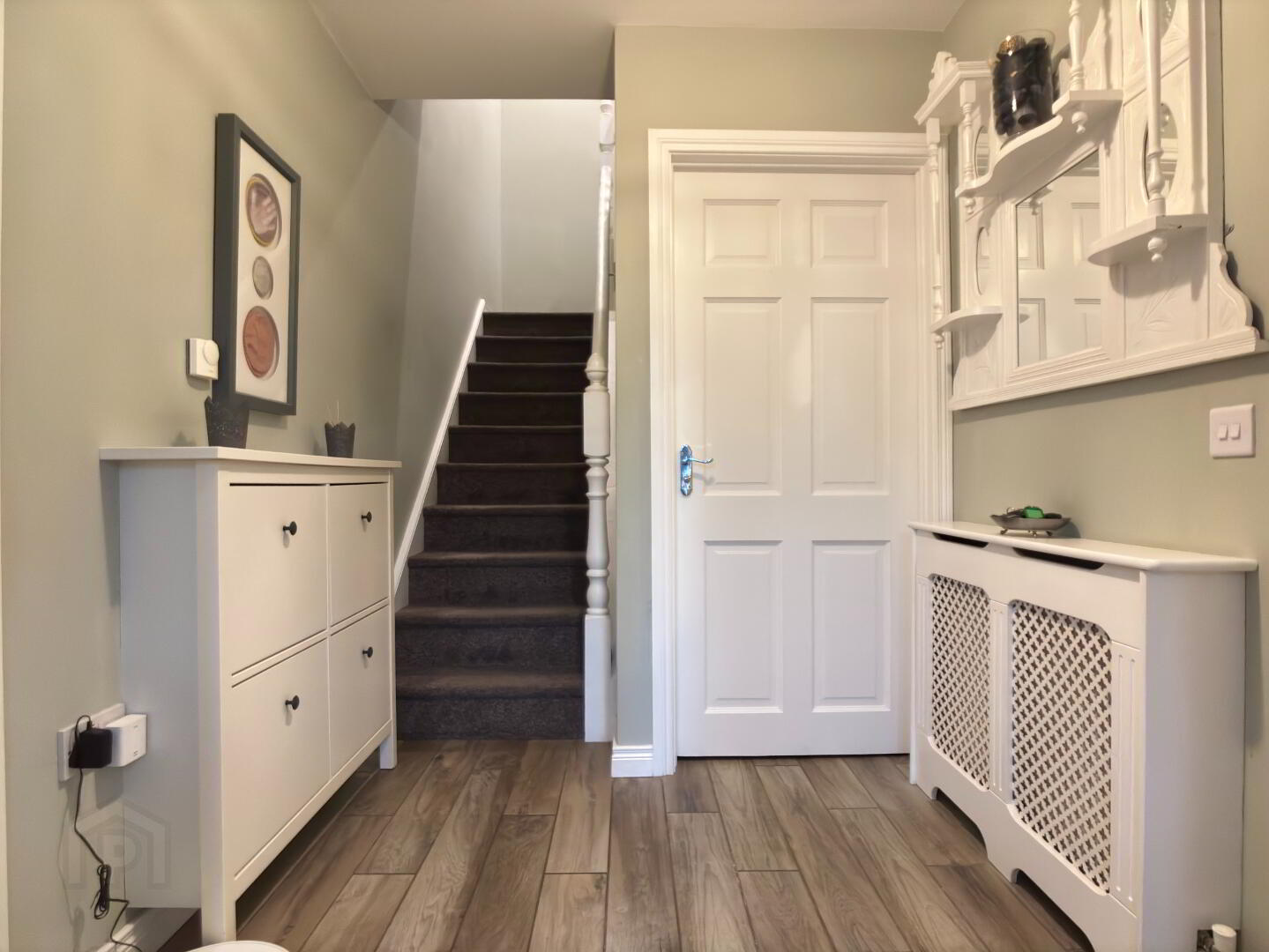 White PVC entrance door with glazed panel and glazed side panels leading to hallway, single panel radiator and seamless tile flooring flowing through to the hallway and kitchen.