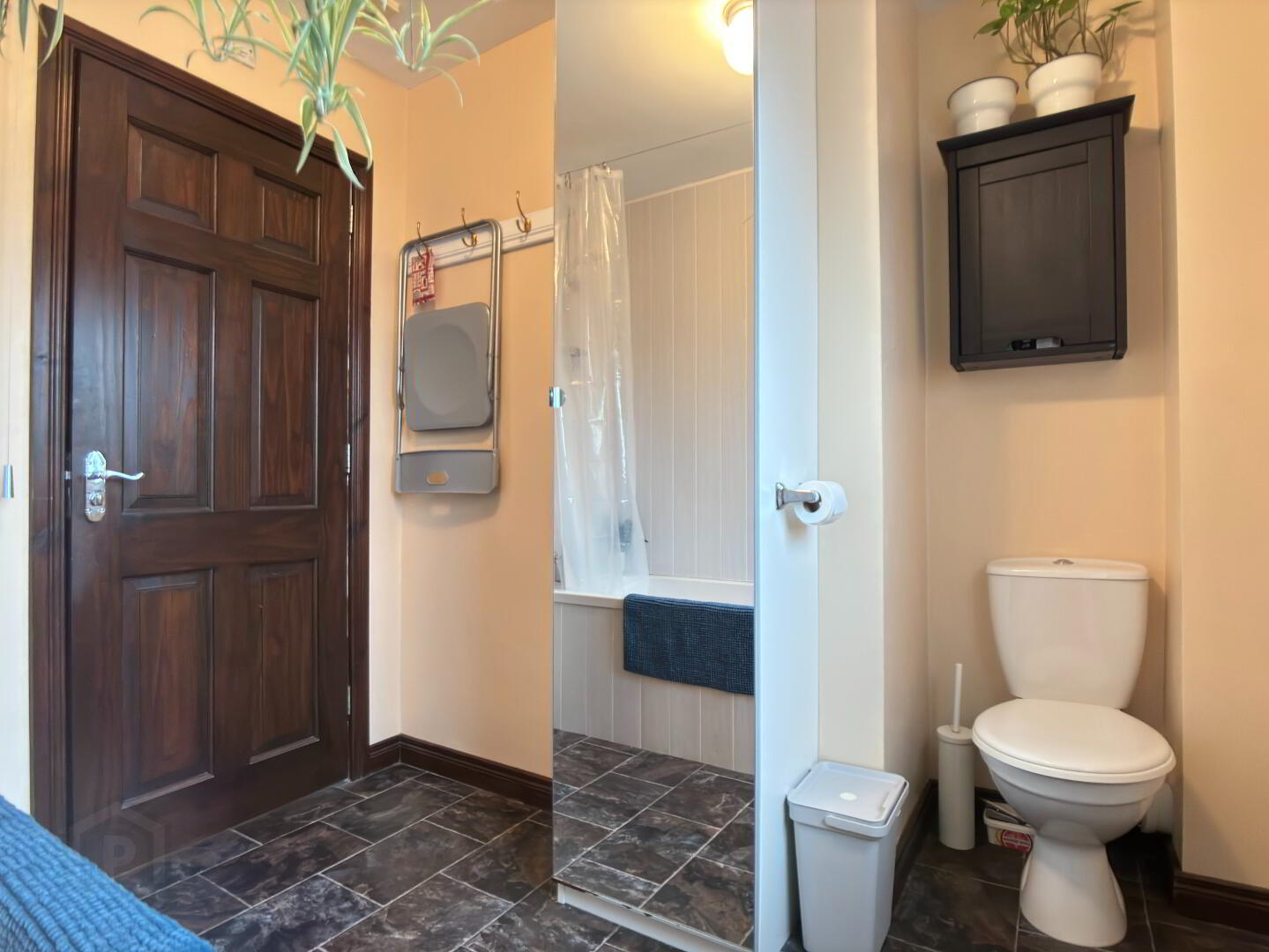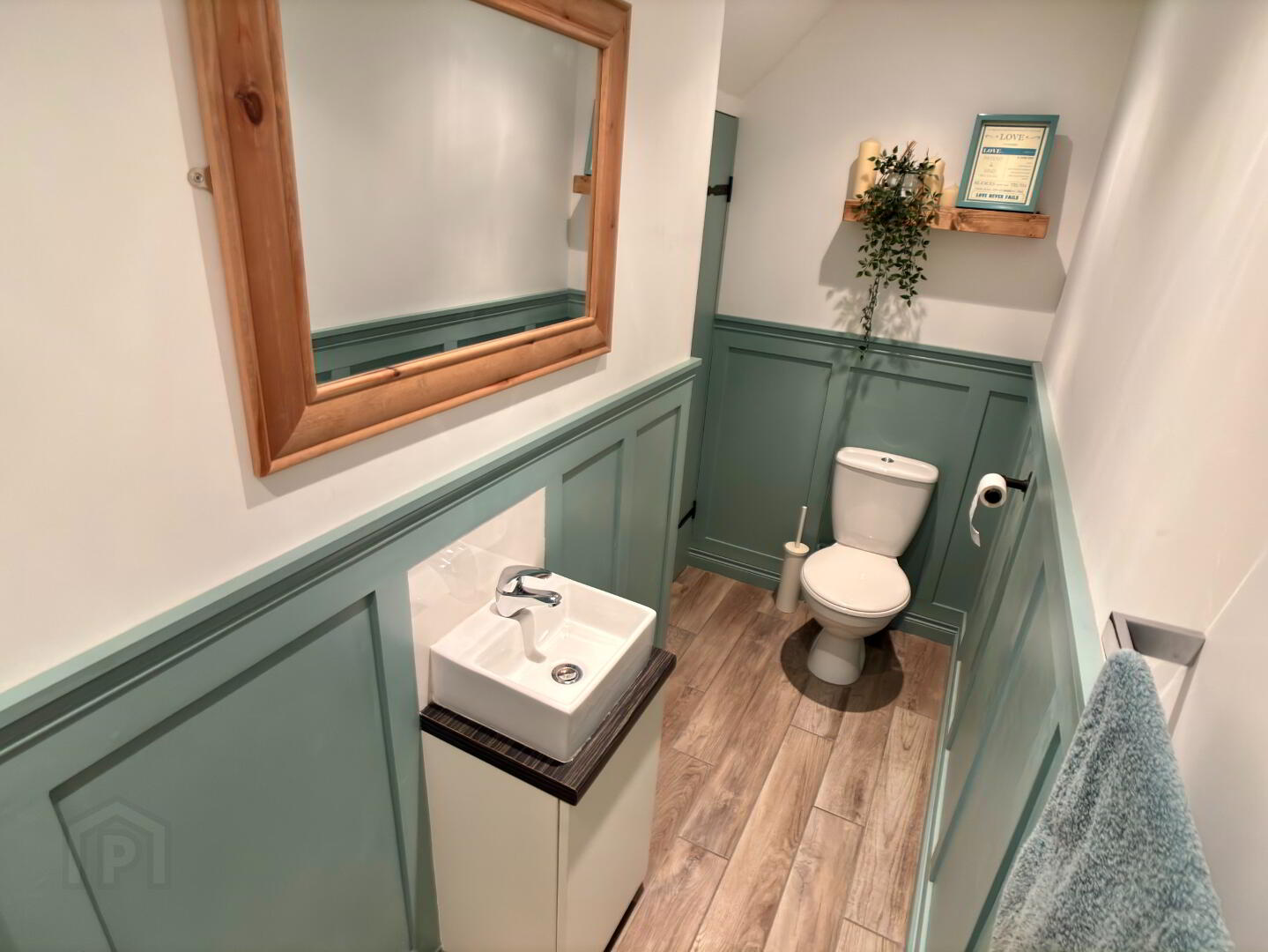 Two piece white suite comprising wash hand basin embedded in vanity unit and wc, single panel radiator, tile flooring, extractor fan, recessed downlighting and spacious storage cupboard.