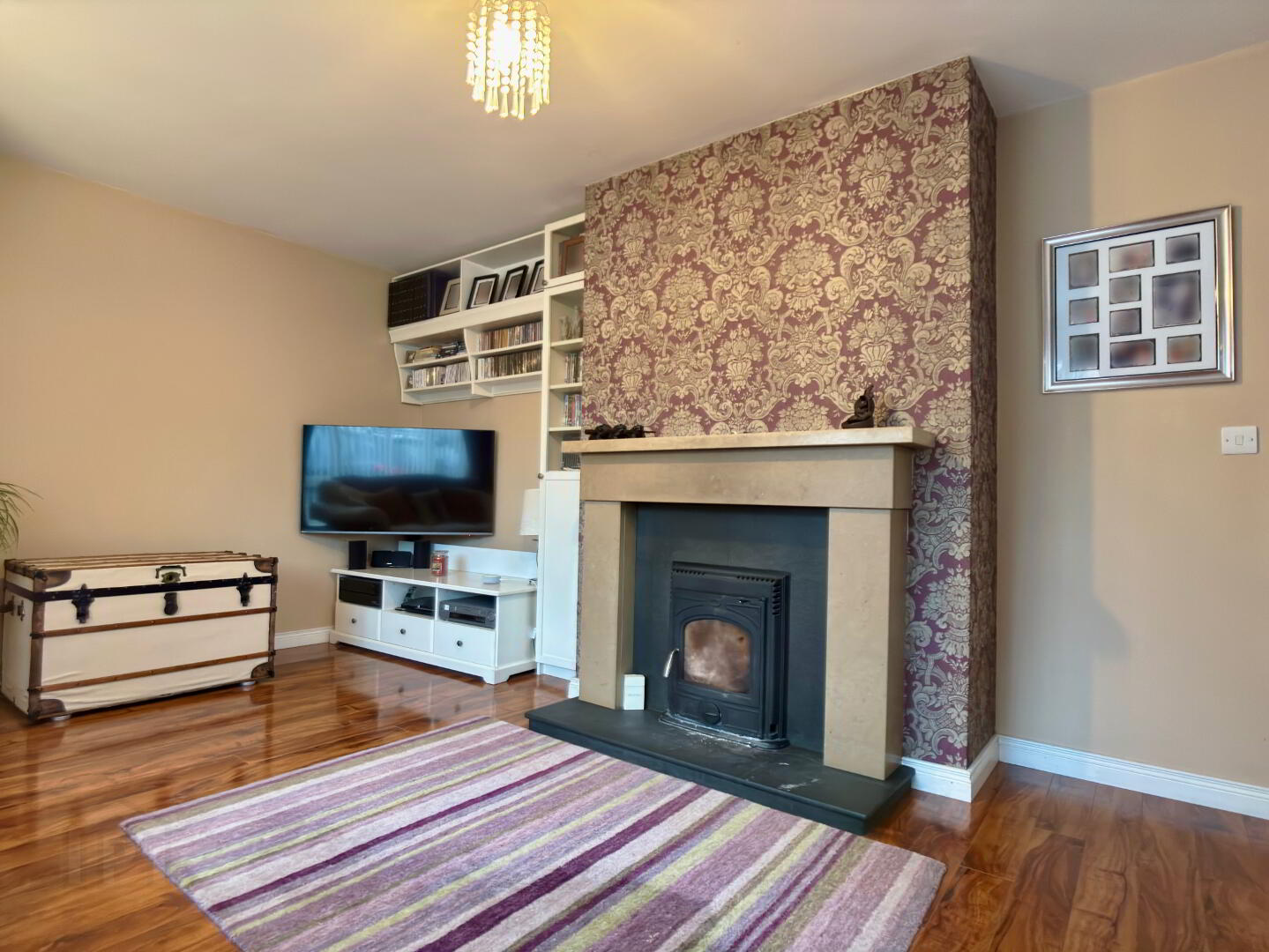 Front and side aspect living room with multi fuel stove insert in feature fireplace, double panel radiator, vertical blinds and engineered wood flooring.
