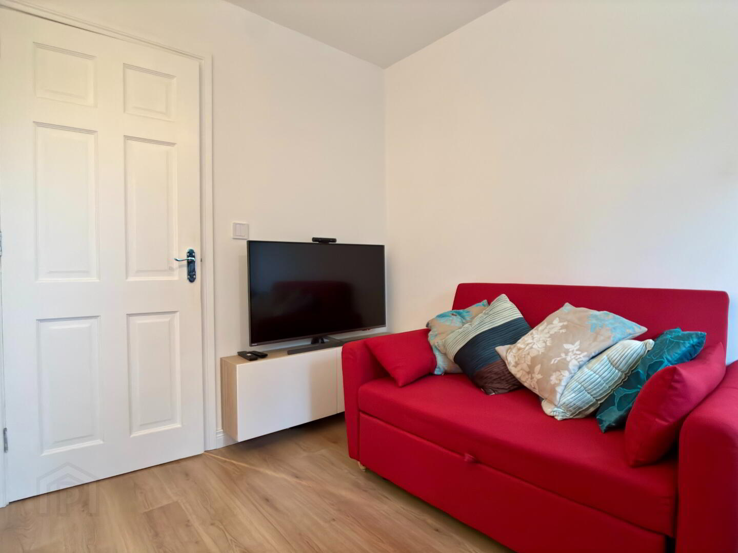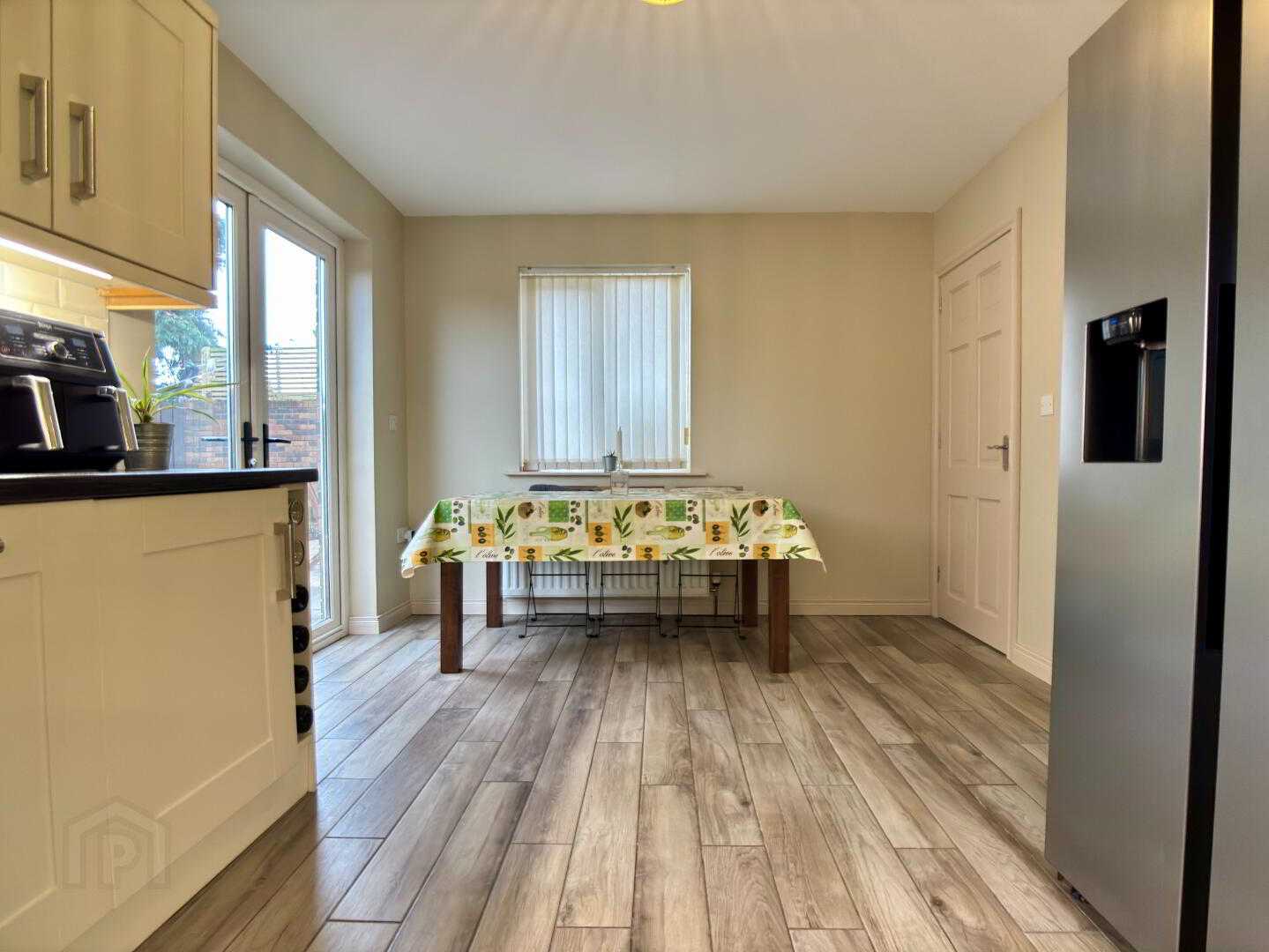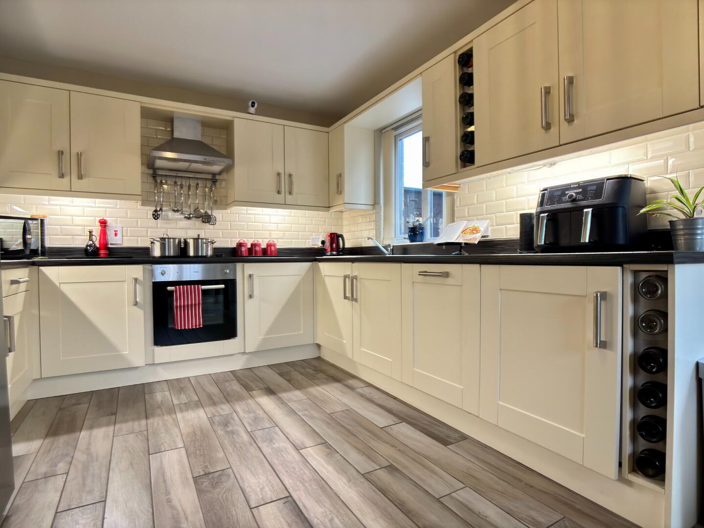 Bright and spacious kitchen/dining area, 1.5 stainless steel sink bowls and drainer, integrated oven and hob with stainless steel extractor fan above. Integrated washing machine and dishwasher and space for fridge/freezer. Part tiled walls, double panel radiator, vertical blinds and seamless tile flooring. Patio doors leading to rear garden. An abundance of wall sockets with USB charging ports. Space for table and chairs.