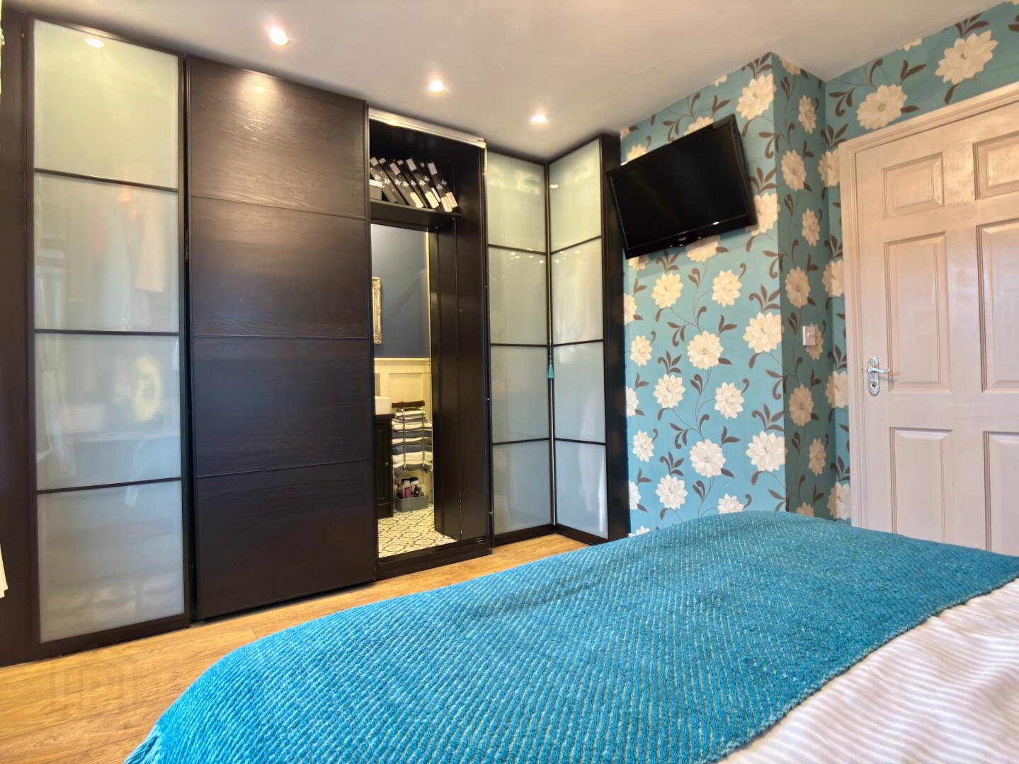 Front aspect double bedroom with concealed ensuite shower room behind fitted wardrobes, double panel radiator, vertical blinds, recessed downlighting and wooden laminate flooring. An abundance of wall sockets with USB charging ports.