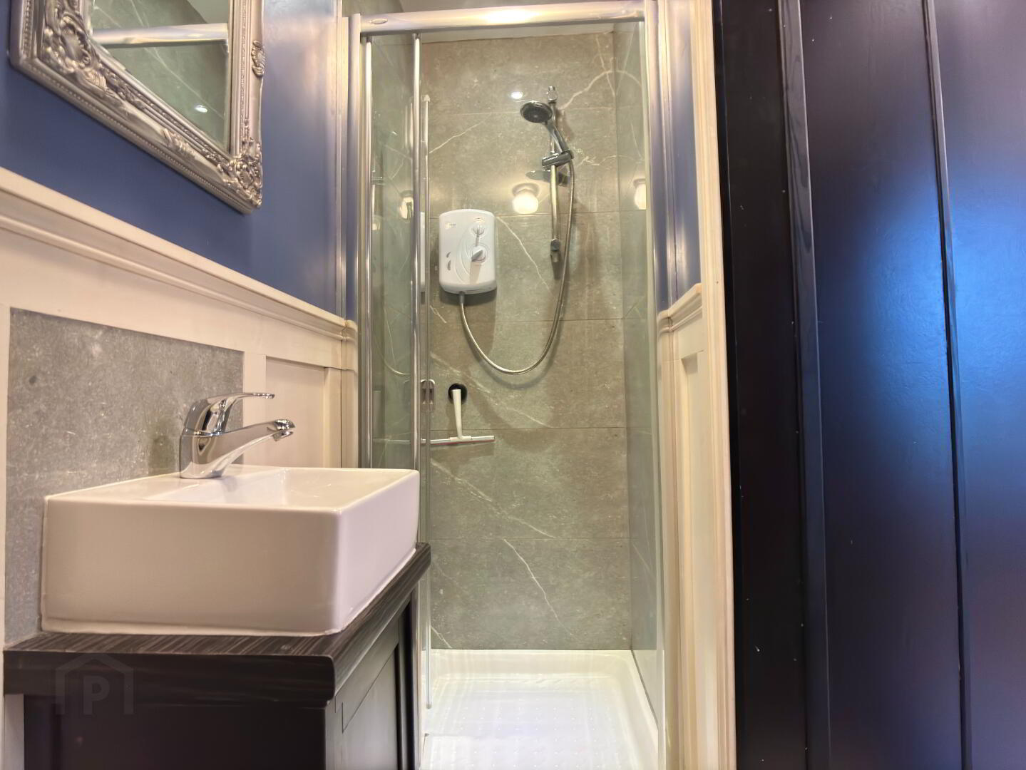 Three piece white suite comprising tiled shower cubicle with electric shower and folding glazed panel, wash hand basin embedded in vanity unit and wc. Extractor fan, single panel radiator, recessed downlighting and vinyl flooring. Shower completed with waterproof tanking kit.