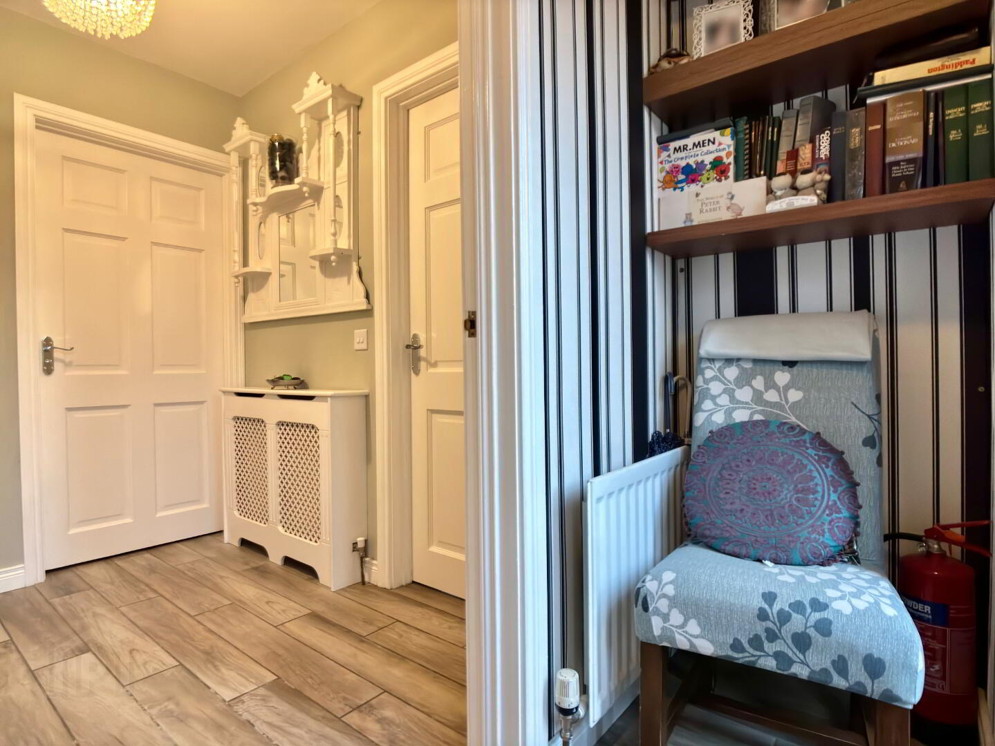 Storage cupboard, single panel radiator, recessed downlighting, single panel radiator and carpet flooring. Access to part floored roofspace with light.