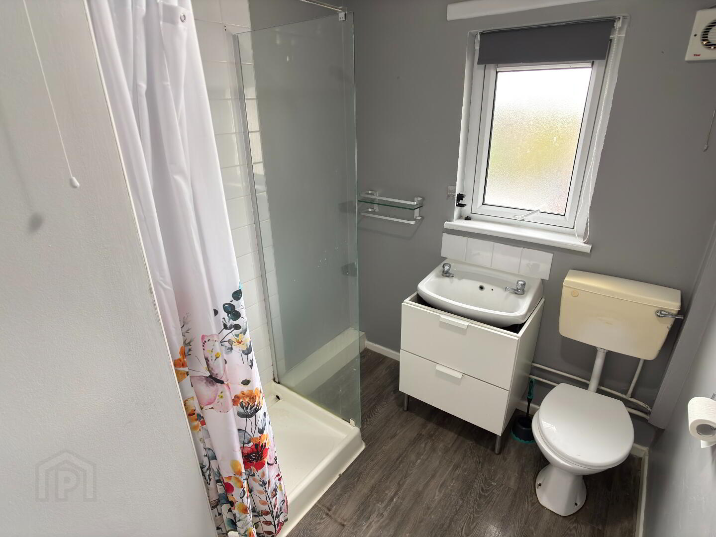 Three piece white suite comprising tiled shower cubicle with electric shower and shower curtain, wash hand basin with vanity unit and wc. Double panel radiator, extractor fan, tile splashback, roller blind and vinyl flooring.