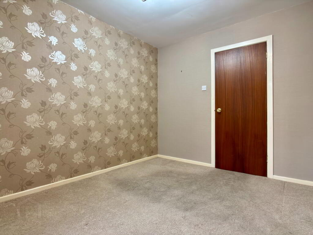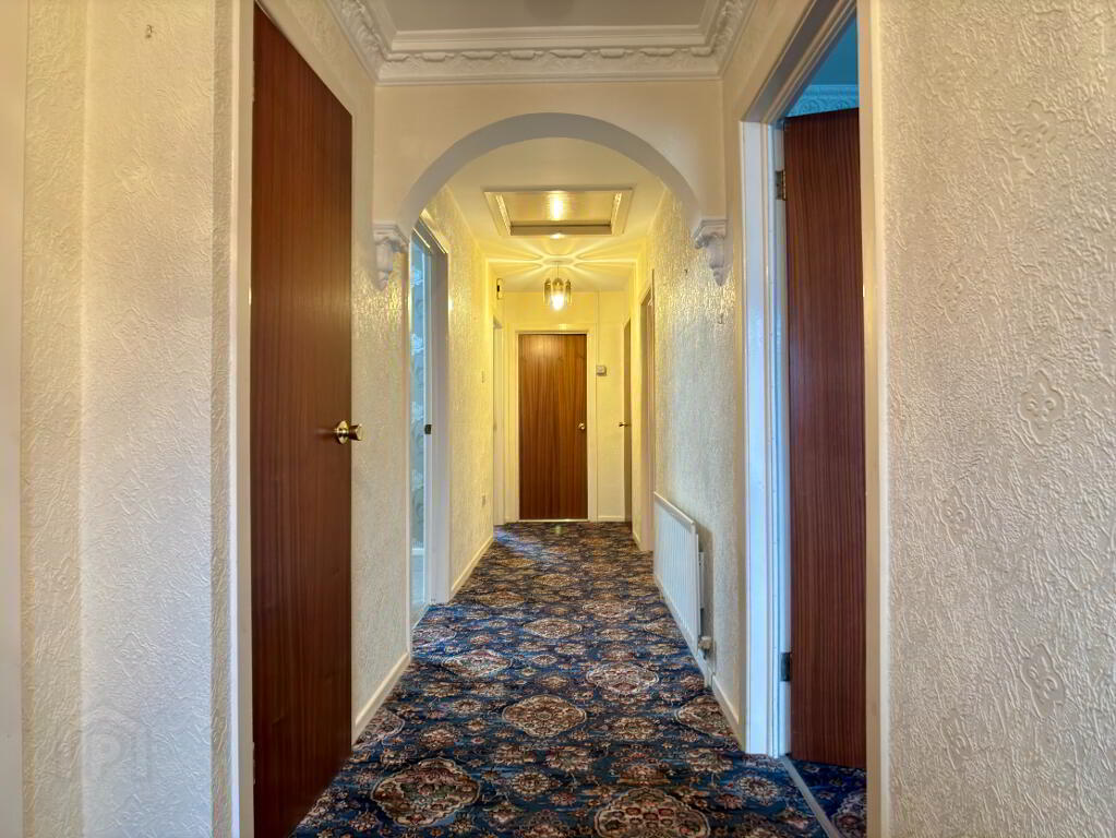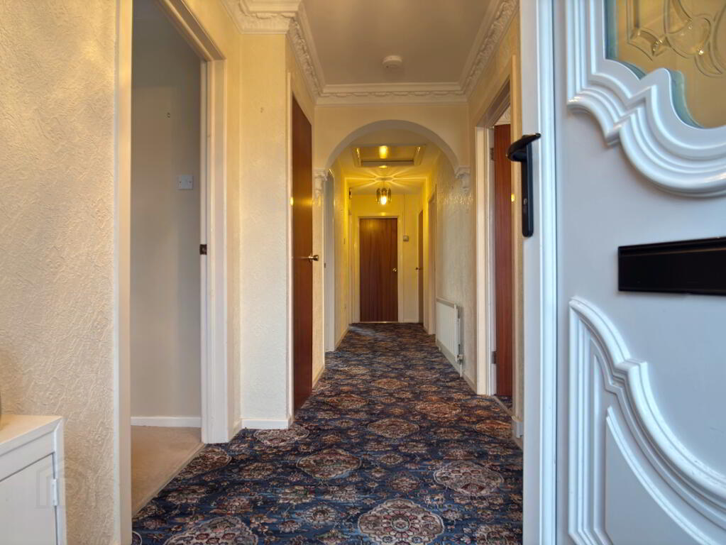 White PVC entrance door with decorative glazed panel and glazed side panel. Enclosed storage cupboard, hot press, single panel radiator and access to roof space.