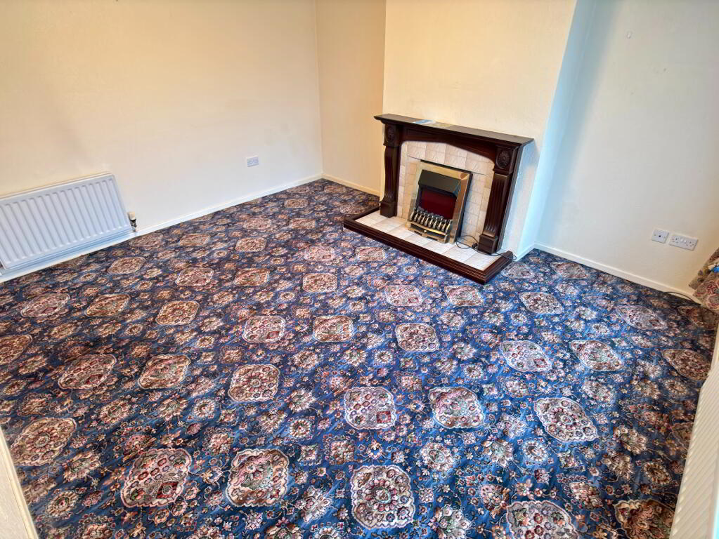 Front aspect living room with electric fire in feature fireplace, double and single panel radiator, vertical blinds and carpet flooring.
