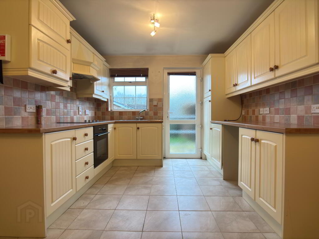 An excellent range of high and low level cupboards and drawers, single stainless steel sink bowl and drainer, integrated oven and hob with extractor fan above. Integrated fridge and space for washing machine and freezer. Double panel radiator, venetian blinds, part tiled walls and tiled flooring. Space for table and chairs.