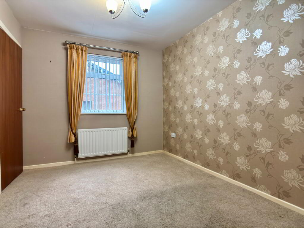 Side aspect double bedroom with built in wardrobe, single panel radiator, vertical blinds and carpet flooring.