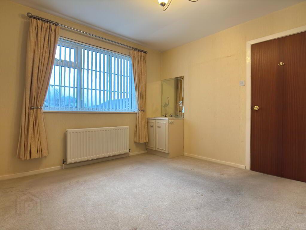 Rear aspect double bedroom with wash hand basin in vanity unit, double panel radiator, vertical blinds and carpet flooring.