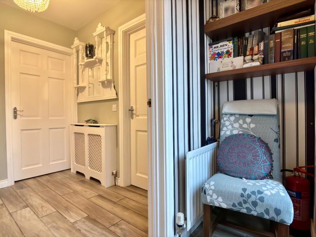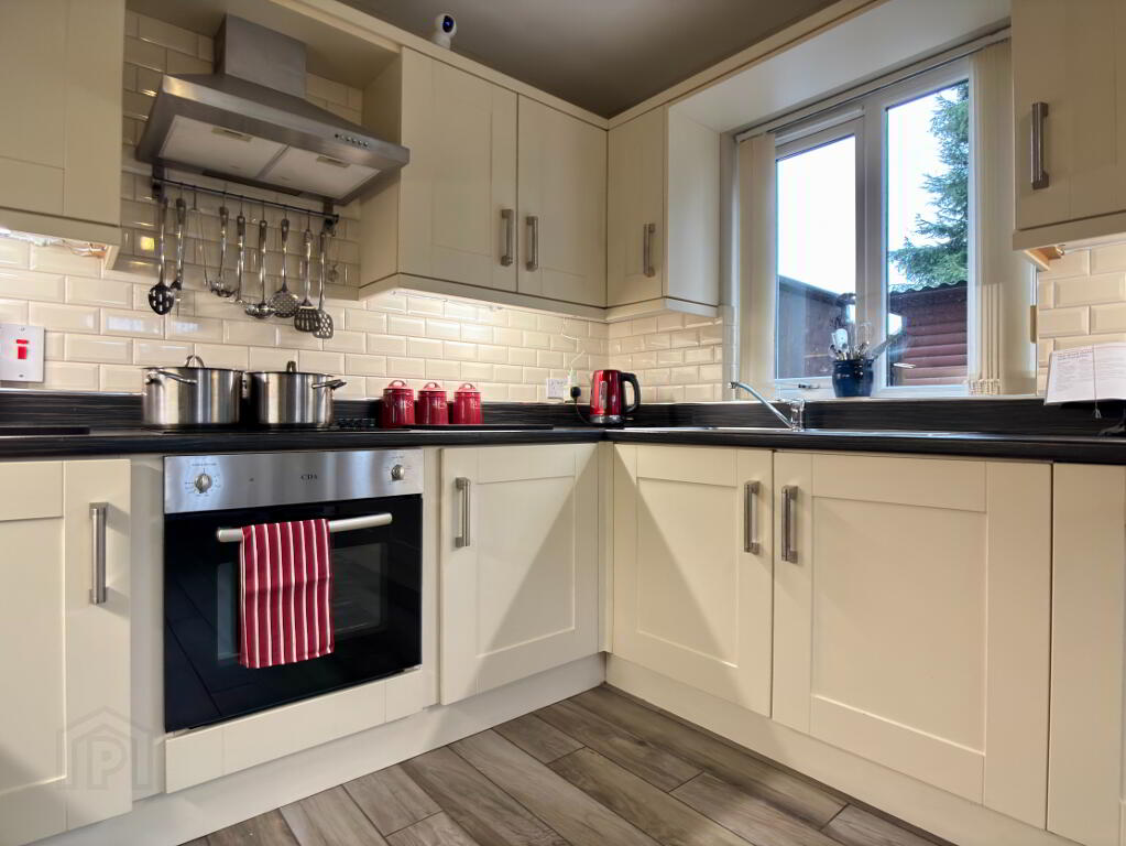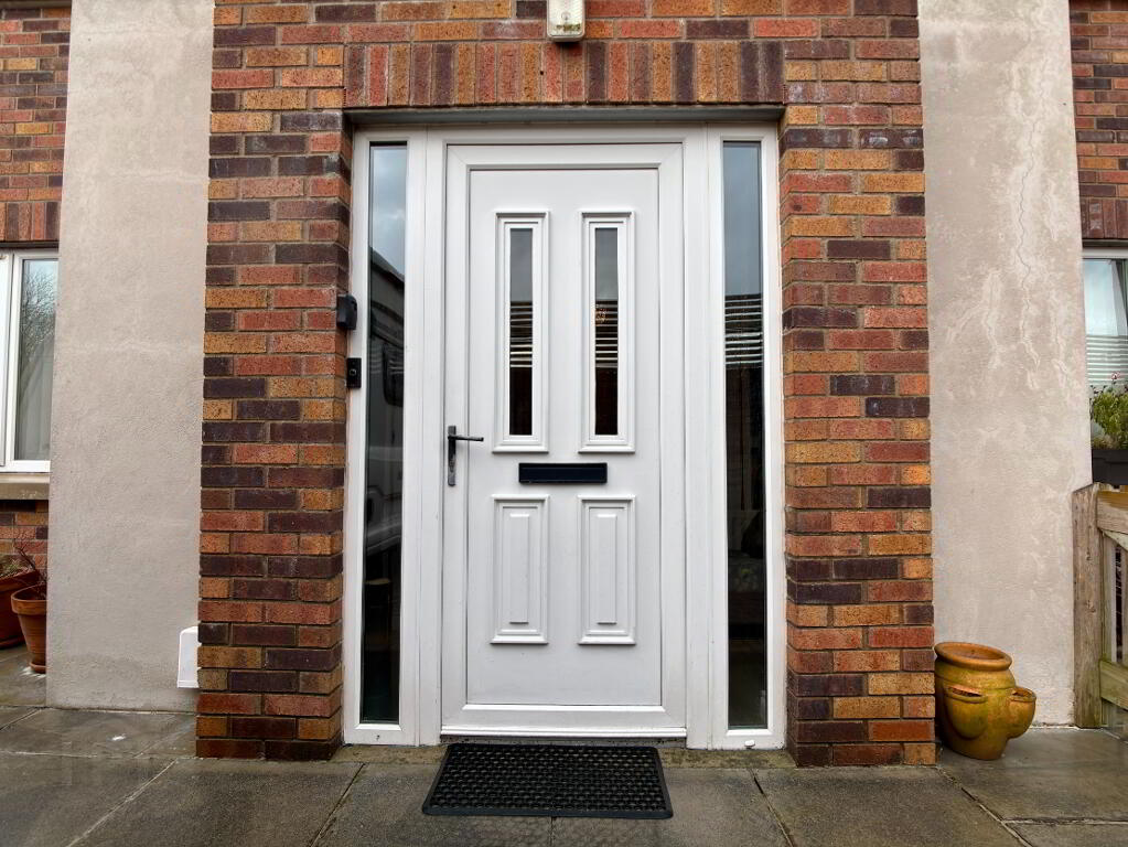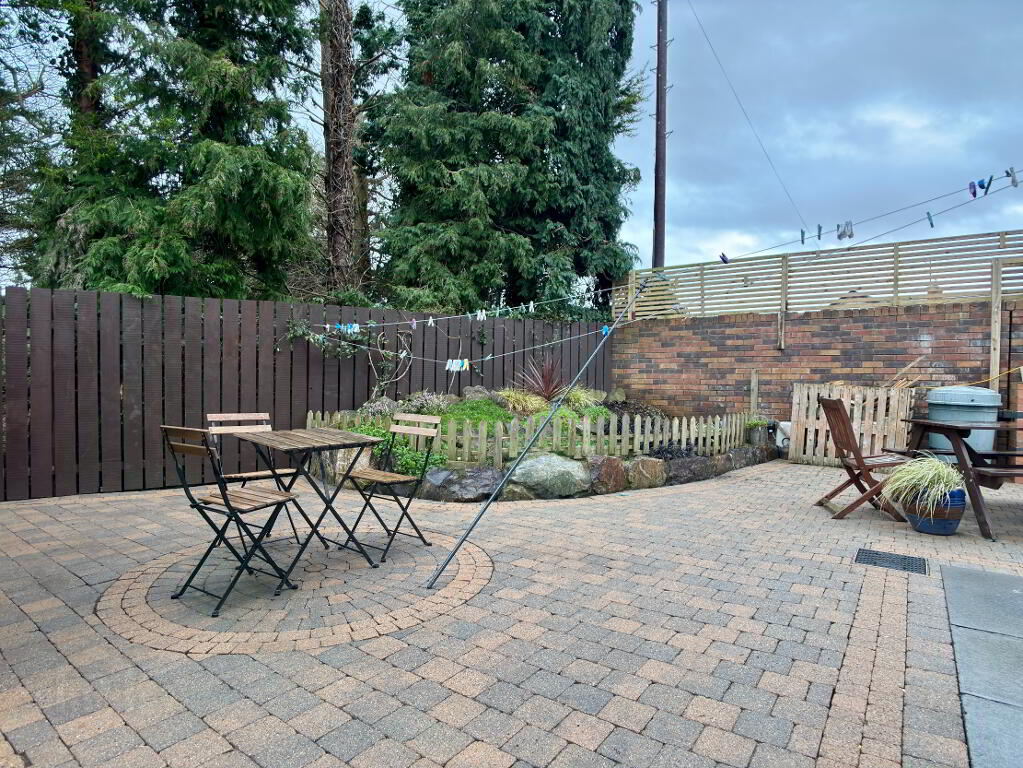 Spacious low maintenance rear garden in decorative Tobermore brick paving and flowerbed in stone border surrounded by wall and timber fencing. Fence to front of property. Electric vehicle charging pod point, external electric socket and water tap. Half log roll shed 12' x 10' on concrete foundation with damp proof course with metal roof and guttering can be purchased at an additional cost. Spacious tarmac driveway providing an abundance of off street parking for numerous vehicles.