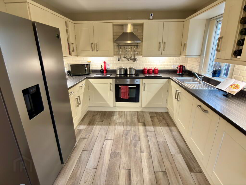 Bright and spacious kitchen/dining area, 1.5 stainless steel sink bowls and drainer, integrated oven and hob with stainless steel extractor fan above. Integrated washing machine and dishwasher and space for fridge/freezer. Part tiled walls, double panel radiator, vertical blinds and seamless tile flooring. Patio doors leading to rear garden. An abundance of wall sockets with USB charging ports. Space for table and chairs.