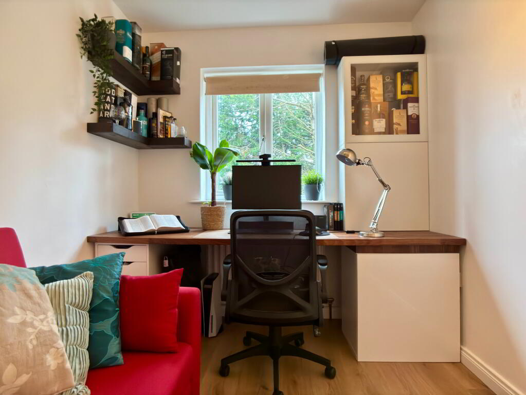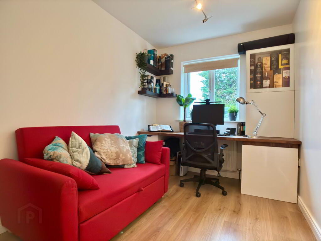 Rear aspect single bedroom currently used an office, single panel radiator, wooden flooring and roller blind.