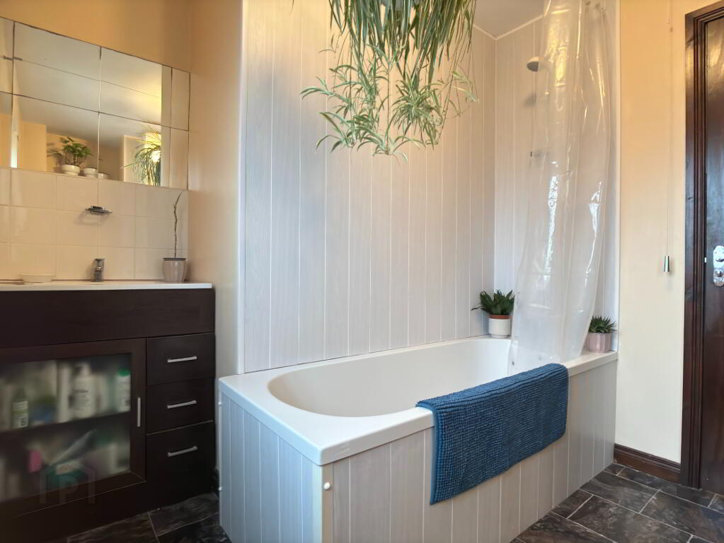 Three piece white suite comprising panelled bath with mains fitment shower and shower curtain, wash hand basin embedded in vanity unit and wc. PVC panelling, tiled splashback, double panel radiator, extractor fan and vinyl flooring.