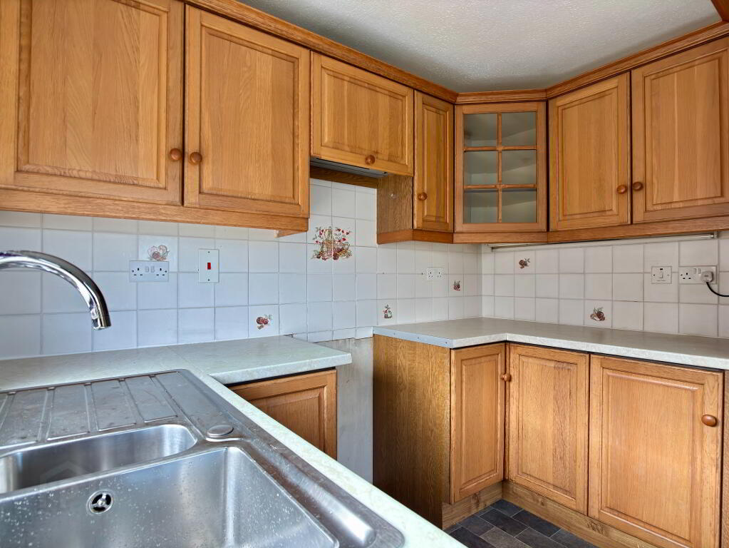 A good range of high and low level cupboards and drawers, 1.5 stainless steel sink bowls and drainer, space for cooker and fridge/freezer, double panel radiator, vertical blinds and vinyl flooring. Space for table and chairs.