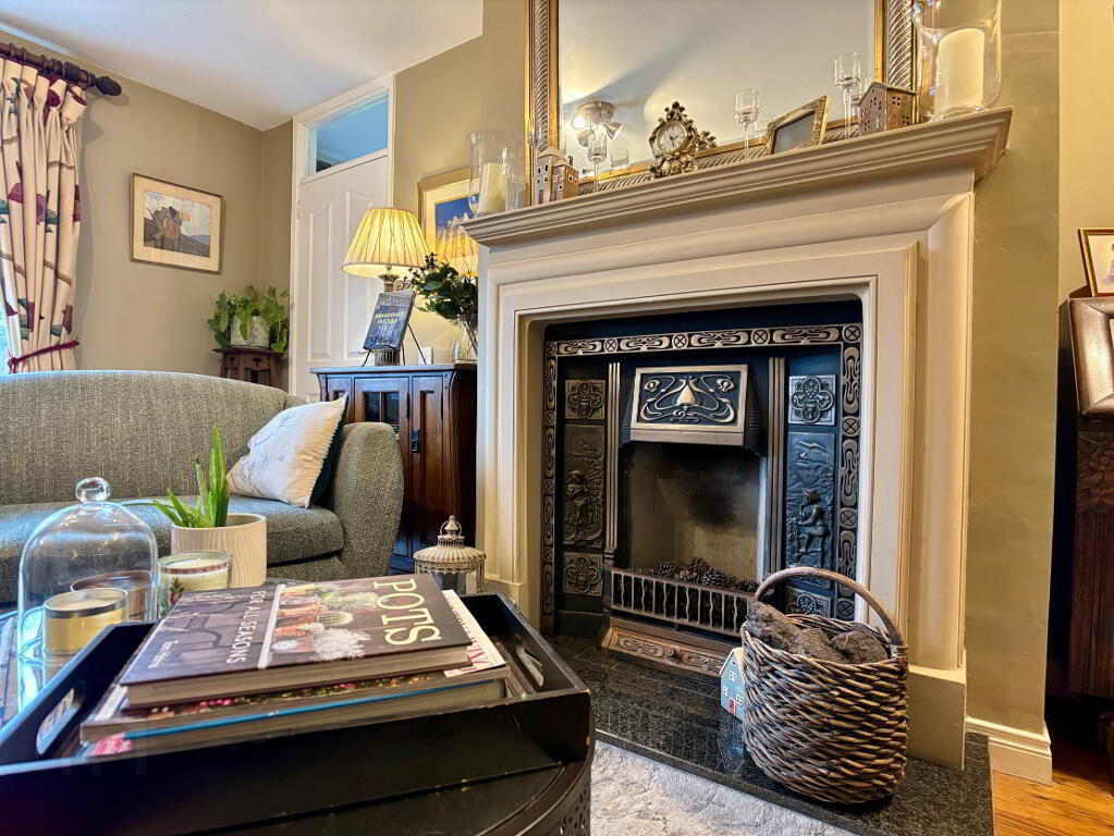 Front aspect living room with open fire with back boiler in feature fireplace, double panel radiator and Pergo wooden flooring.
