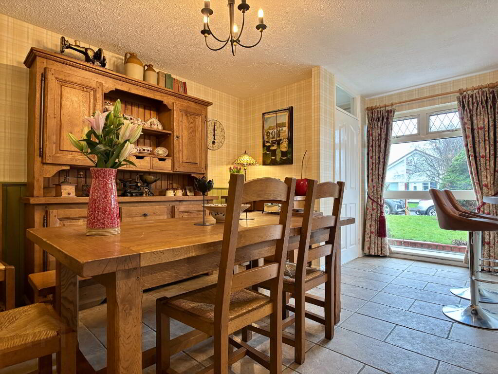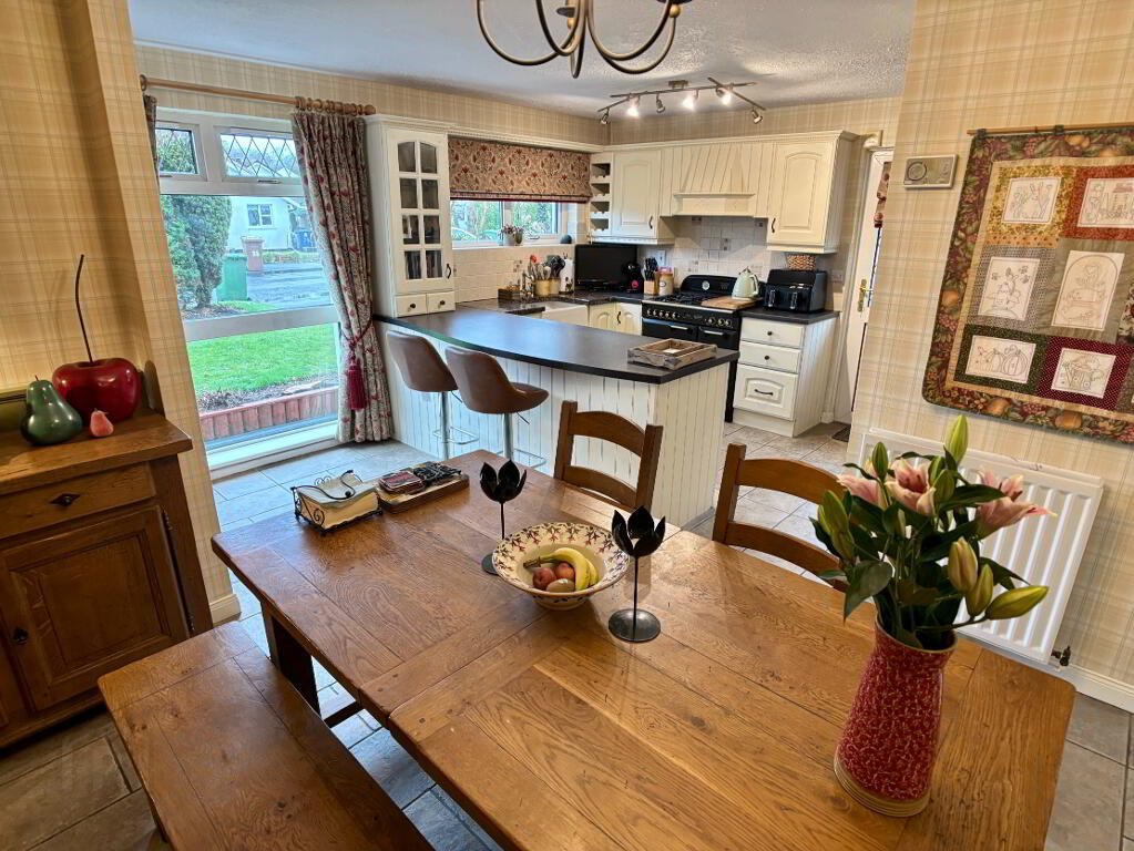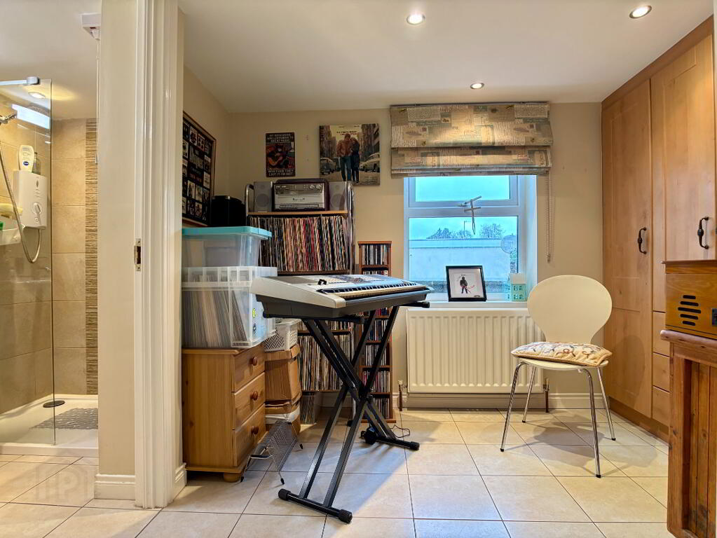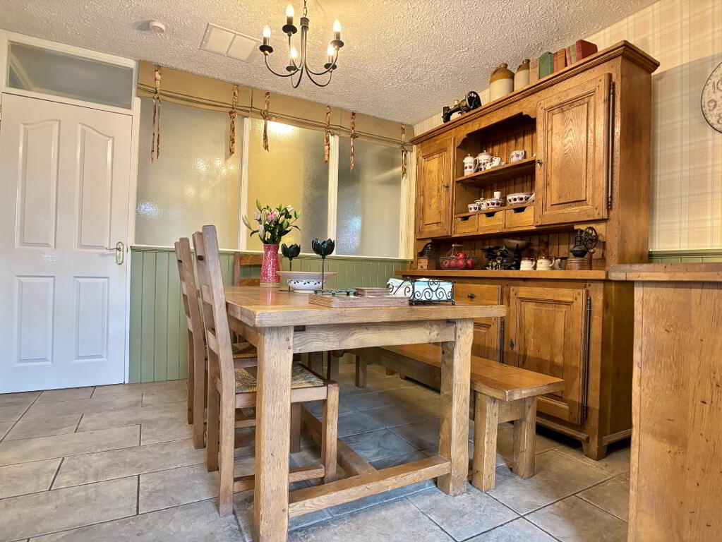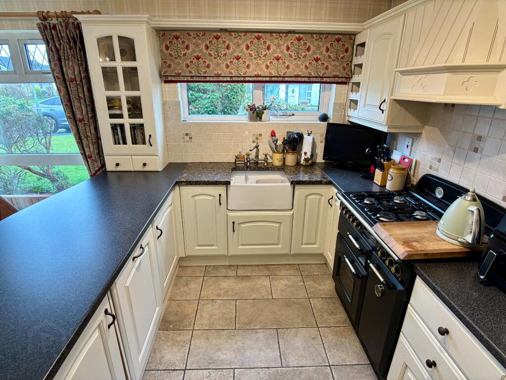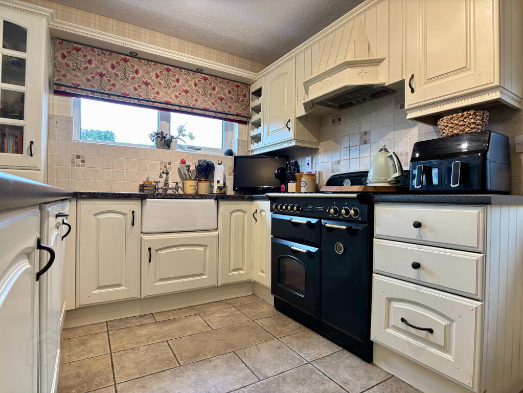 Open plan kitchen/dining room with an excellent range of high and low level cupboard and drawers with breakfast bar. Belfast sink bowl, Rangemaster cooker with extractor fan above, integrated undercounter fridge, freezer and dishwasher. Part tiled walls, tiled flooring, double panel radiator and pelmet lighting. Enclosed hot press. Space for table and chairs. Part glazed door to rear of property.