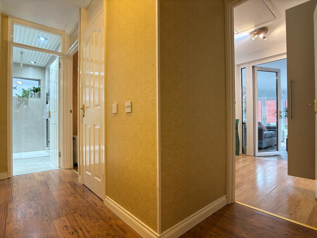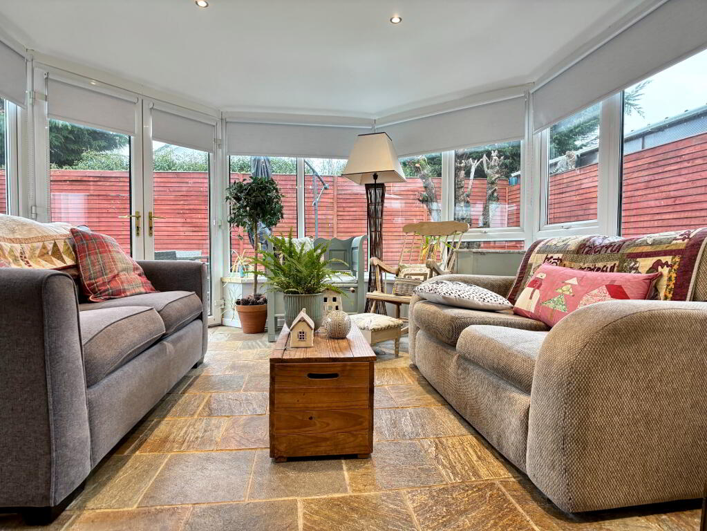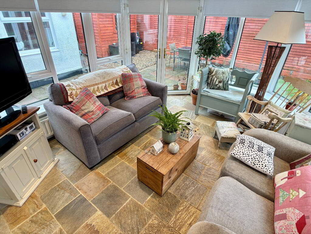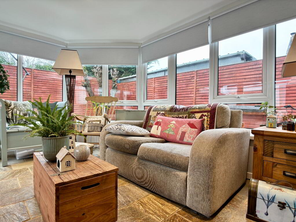 Bright and spacious sunroom, two double panel radiators, roller blinds, recessed downlighting and tile flooring. Patio doors to rear of property.