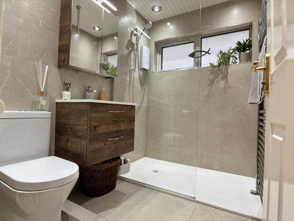 Three piece white suite comprising walk in shower with Mira electric shower and glazed panel, wash hand basin embedded in vanity unit and wc. Wall mirror, towel radiator, part tiled walls and tile flooring, extractor fan and recessed downlighting.
