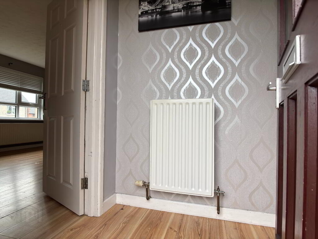 Wooden entrance door with glazed panel leading to entrance hall, double panel radiator and laminate flooring.