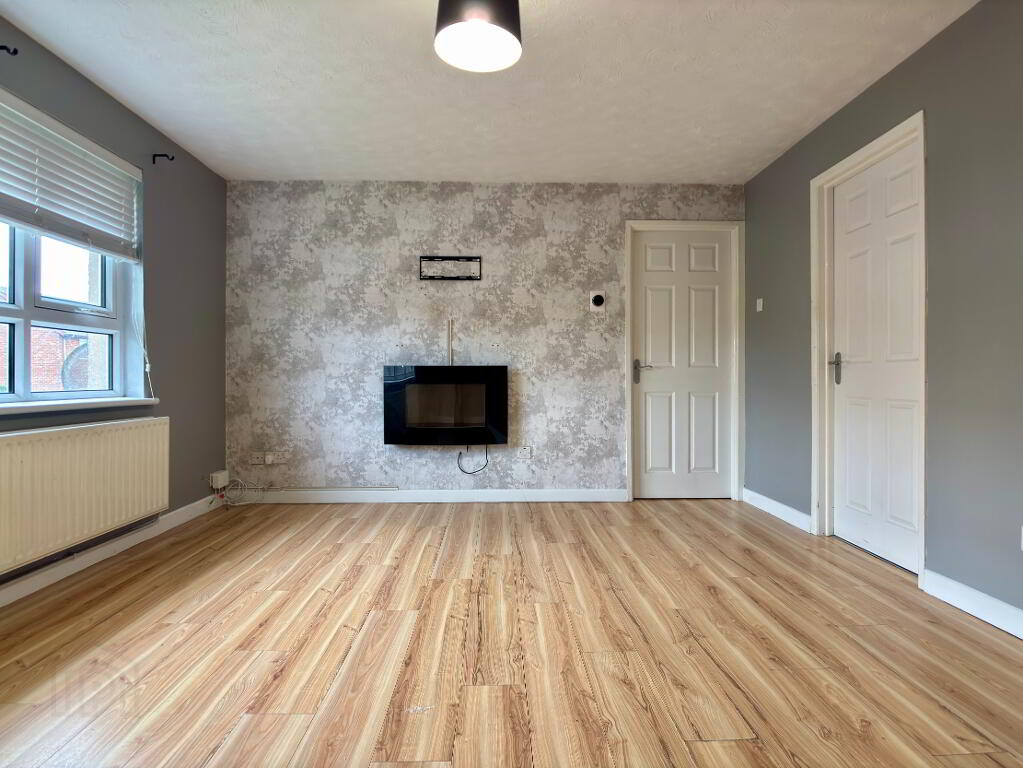 Side aspect living room with wall mounted electric fire, double panel radiator, venetian blinds, Hive heating control and laminate flooring.