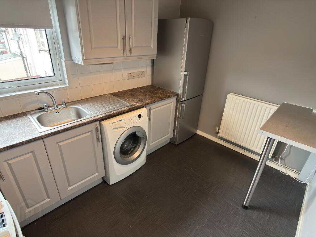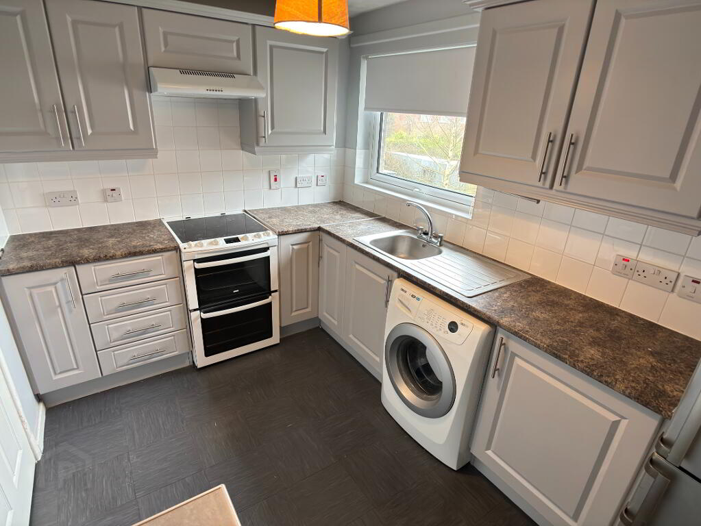 A good range of high and low level cupboards and drawers, stainless steel sink bowl and drainer, cooker with extractor fan above, fridge/freezer and washing machine. Double panel radiator, part tiled walls and breakfast bar.