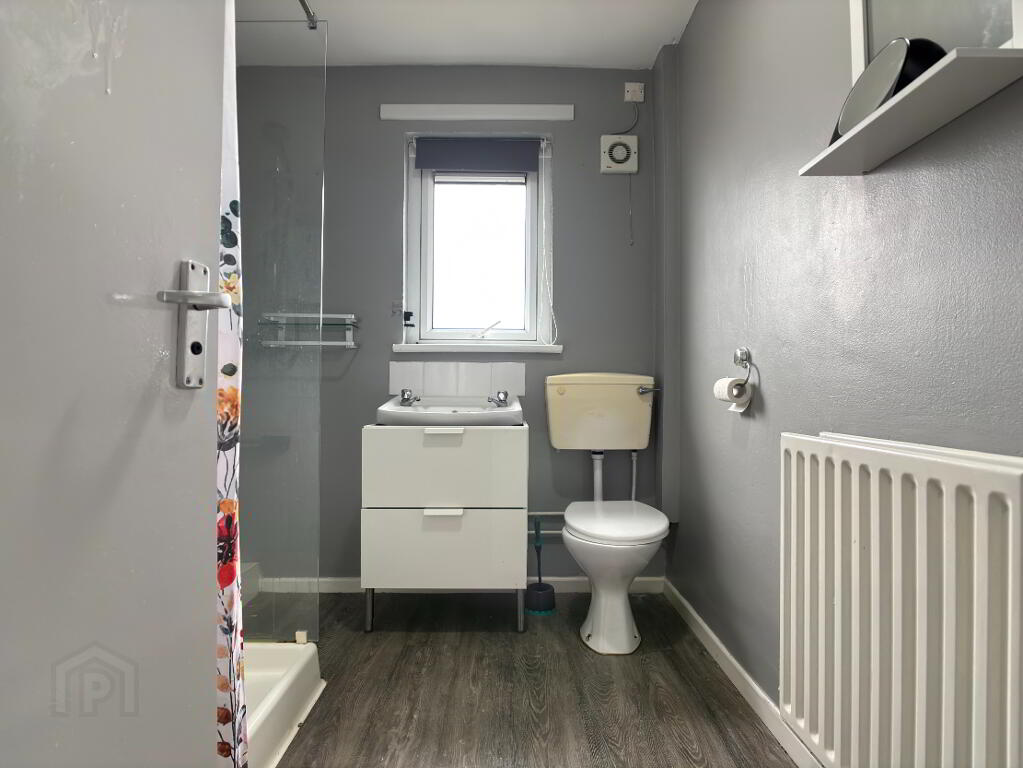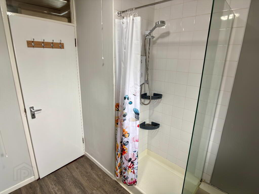 Three piece white suite comprising tiled shower cubicle with electric shower and shower curtain, wash hand basin with vanity unit and wc. Double panel radiator, extractor fan, tile splashback, roller blind and vinyl flooring.