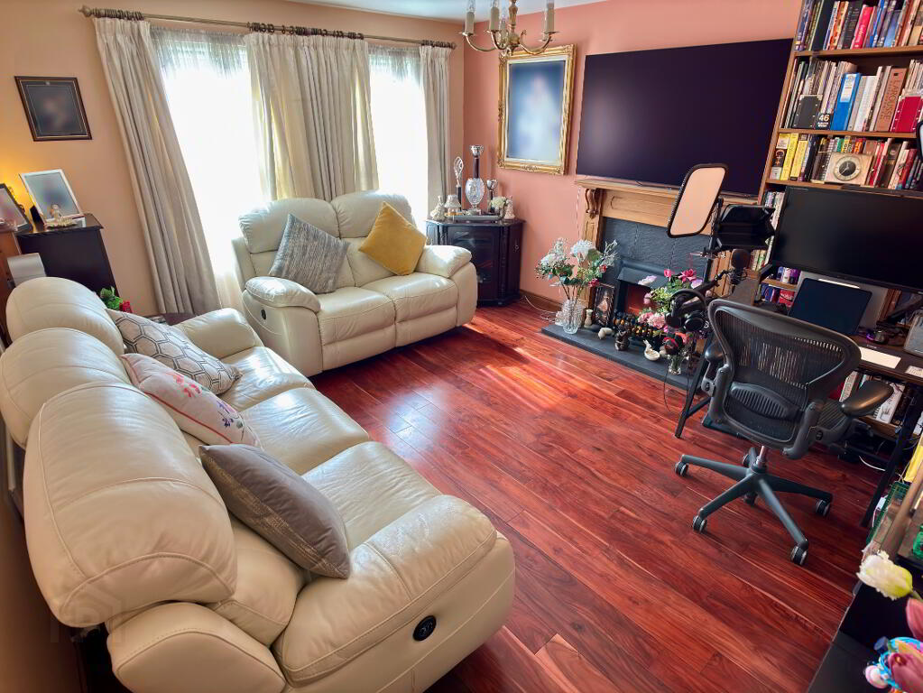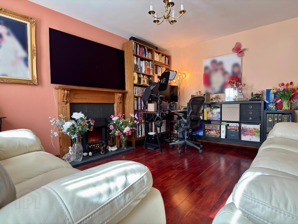 Front aspect living room with electric fire inset in feature fireplace, double panel radiator, voile curtains and exquisite tiger wood solid flooring.
