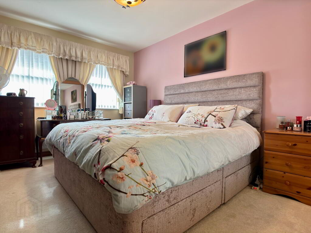 Front aspect double bedroom, single panel radiator, vertical blinds and carpet flooring.